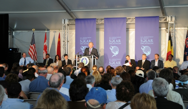 来自美国华盛顿的消息,9月22日,美国太阳能十项全能竞赛在华盛顿West Potomac公园正式开幕。美国能源部有关官员以及2012年、2013年组委会代表出席并致辞。在600多名学生的欢呼声中,一双巨剪剪开了开赛的彩带。