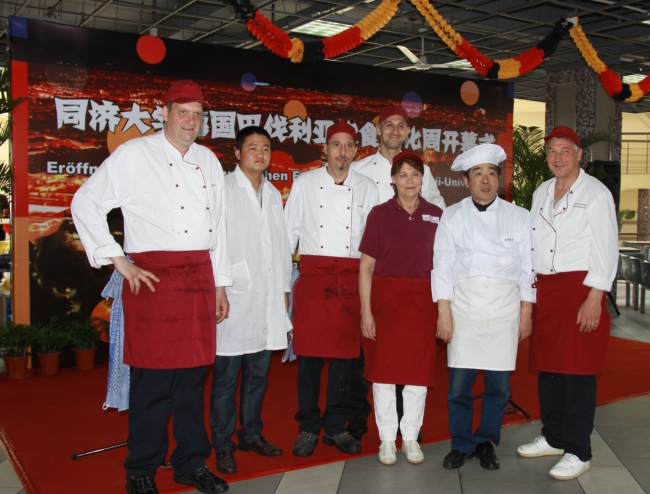 在4月6日举行的“同济大学德国巴伐利亚饮食文化周”闭幕式上。慕尼黑大学生服务中心的瓦恩多夫先生在致辞中表示“我们为大家可以欢聚一堂,享用我们精心准备的食物而喜悦,也为我们今夜就要离开同济而难过。非常高兴这几天能和同济的同行切磋厨艺,共同烹制菜肴,也非常感谢同济后勤的热情接待。”他还用中文一字一顿地说:“我—非—常—喜—欢—同—济!”博得了满堂喝彩。