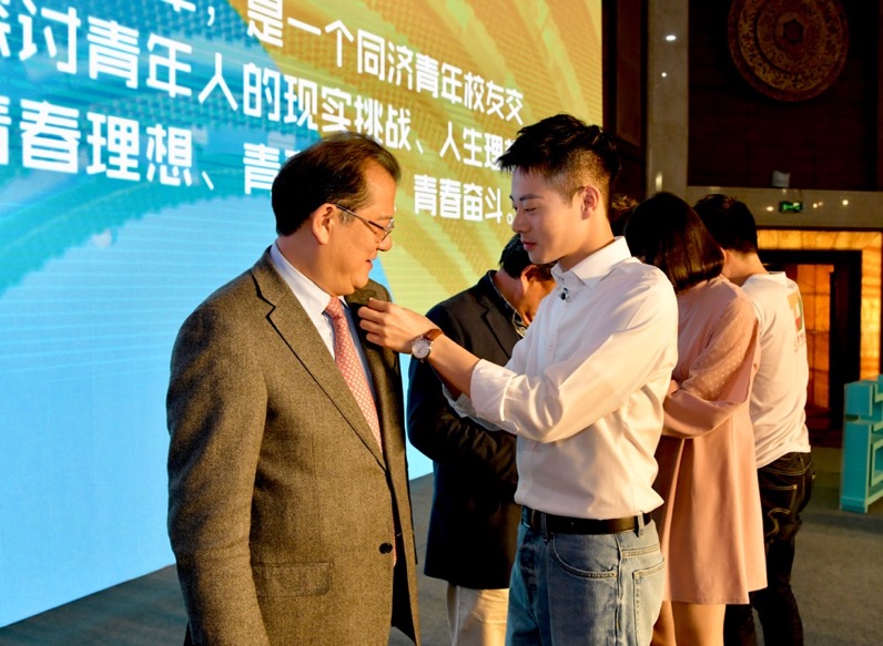 青年校友代表向出席论坛的校领导赠送“同济青年”徽章