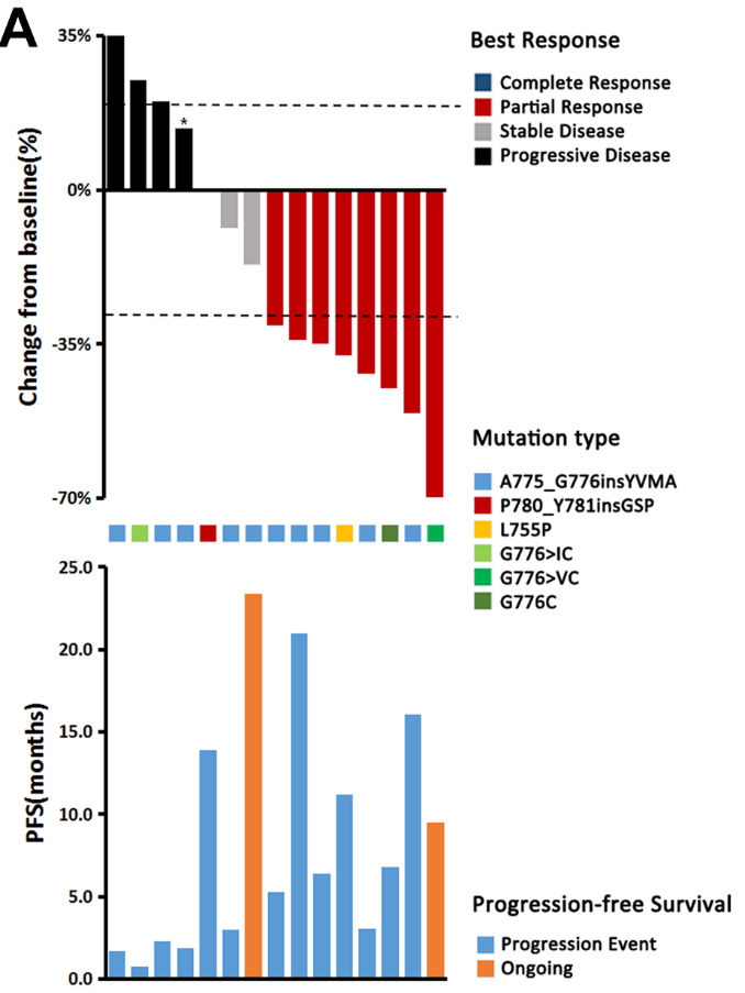吡咯替尼治疗HER2突变晚期非小细胞肺癌的2期研究,共入组15名患者,均接受过多线治疗,客观缓解率(ORR)为53.3%,中位无进展生存期(PFS)为6.4个月,4位患者的PFS时间超过1年,1位患者的PFS时间超过2年。其中,67%(10/15)的患者突变为A775_G776YVMA插入突变,其他HER2突变类型G776C, G776>VC, L755P,P780_Y781insGSP也对吡咯替尼有效。