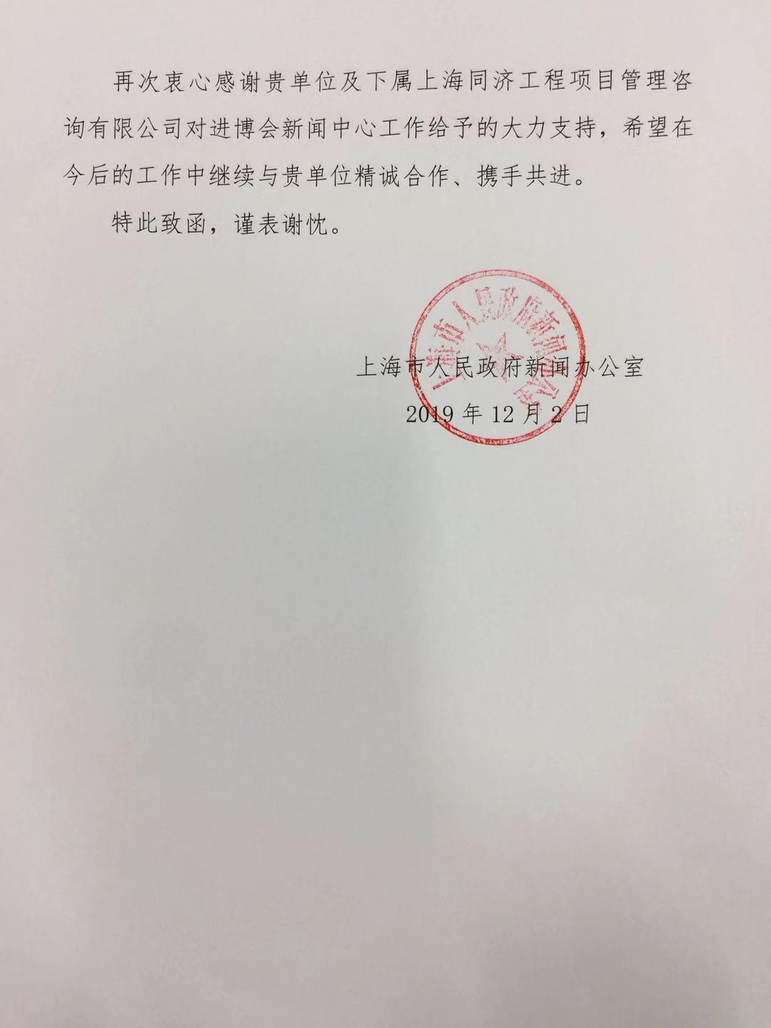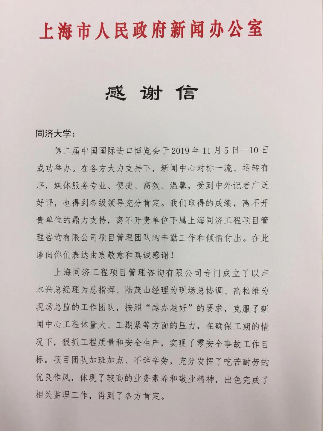 信中这样写道,第二届中国国际进口博览会于11月5日至10日成功举办。在各方大力支持下,新闻中心对标一流、运转有序,媒体服务专业、便捷、高效、温馨,受到中外记者广泛好评,也得到各级领导充分肯定。这些成绩的取得,离不开同济大学的鼎力支持,离不开同济大学下属上海同济工程项目管理咨询有限公司项目管理团队的辛勤工作和倾情付出。该公司专门成立了以总经理卢本兴为总指挥、经理陆茂山为现场总协调、高松维为现场总监的工作团队,按照“越办越好”的要求,克服了新闻中心工程体量大、工期紧等方面的压力,在确保工期的情况下,狠抓工程质量和安全生产,实现了零安全事故工作目标。项目团队加班加点、不辞辛劳,充分发挥了吃苦耐劳的优良作风,体现了较高的业务素养和敬业精神,出色完成了相关监理工作,得到了各方肯定。