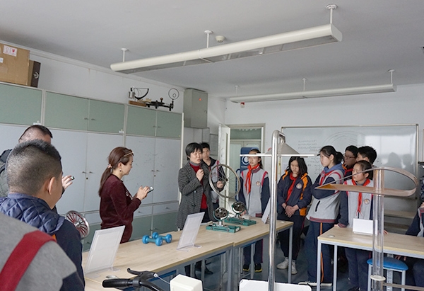 中学生在关工委老同志带领下,在我校物理实验室参观。