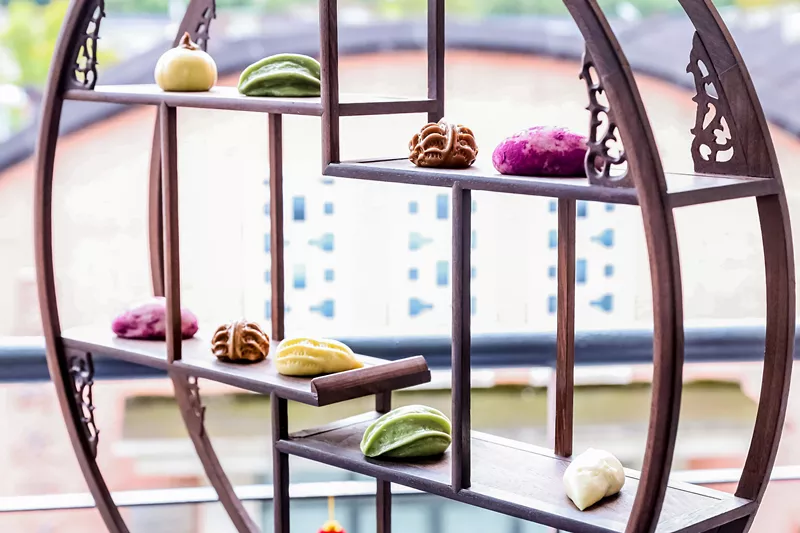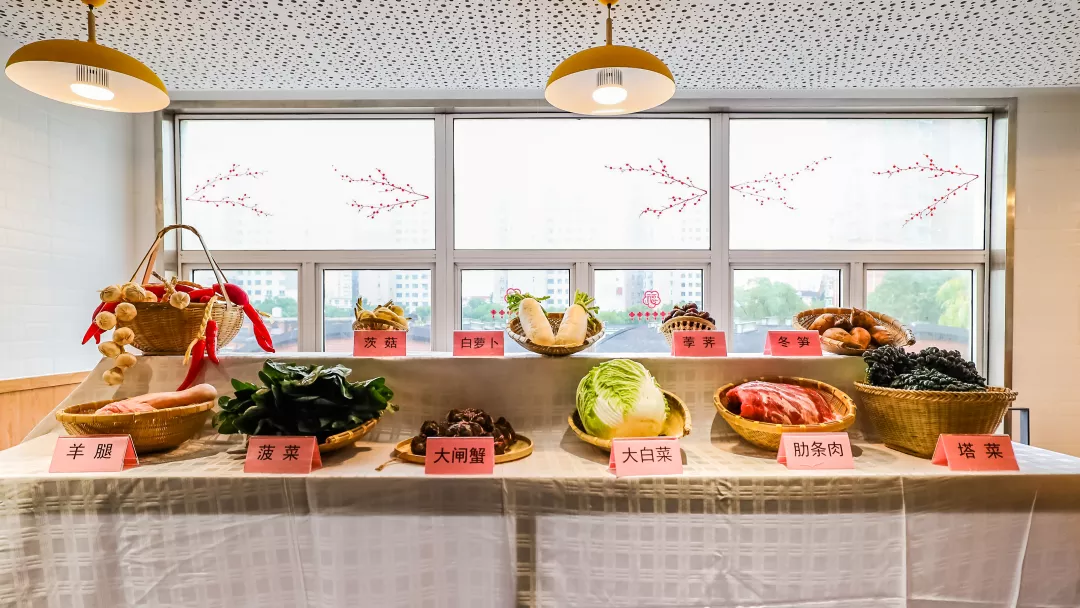 当天,为更好地营造冬至节气的体验氛围,面食部进行了精心的设计和布置。面食部门口摆放了精致的中式面点,茄子、核桃、花生、杨桃、南瓜等造型各异的面点皆以面粉与天然食材制成,纹理清晰,惟妙惟肖。一进门便可看见两排竹编篮子,个个盛满节气食物。玻璃窗上,张贴着二十四节气的特色窗花和梅花图案,格外秀丽、喜庆。