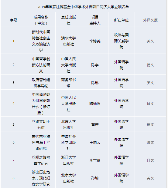 同济8项目入选国家社科基金中华学术外译项目,位列全国第二