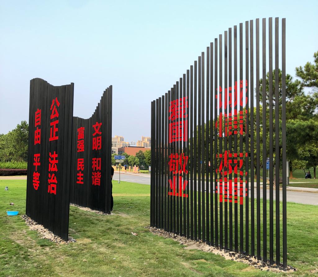 嘉定校区最新打造的两处校园景观也在细节处彰显文化。设立在广大师生进出校门必经的中央大道绿化带《山影》景观,社会主义核心价值观的内容能够随视角变化,时隐时现,让人兴味盎然地一次次学习核心价值观。另一处位于中央大道和嘉四路路口的景观,“创新、协调、绿色、开放、共享”五大发展理念分布于小品之上,弘扬正能量,传播主流思想。