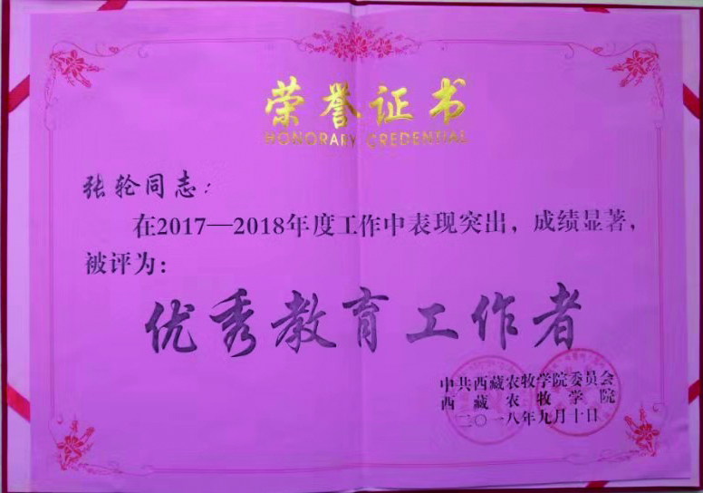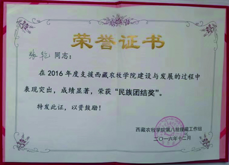张轮教授两次获“民族团结奖”,先后获评2018年西藏农牧学院“优秀教育工作者”、2018年同济大学十大“师德师风优秀教师”、2019年“西藏自治区优秀援藏干部人才”。(黄艾娇)