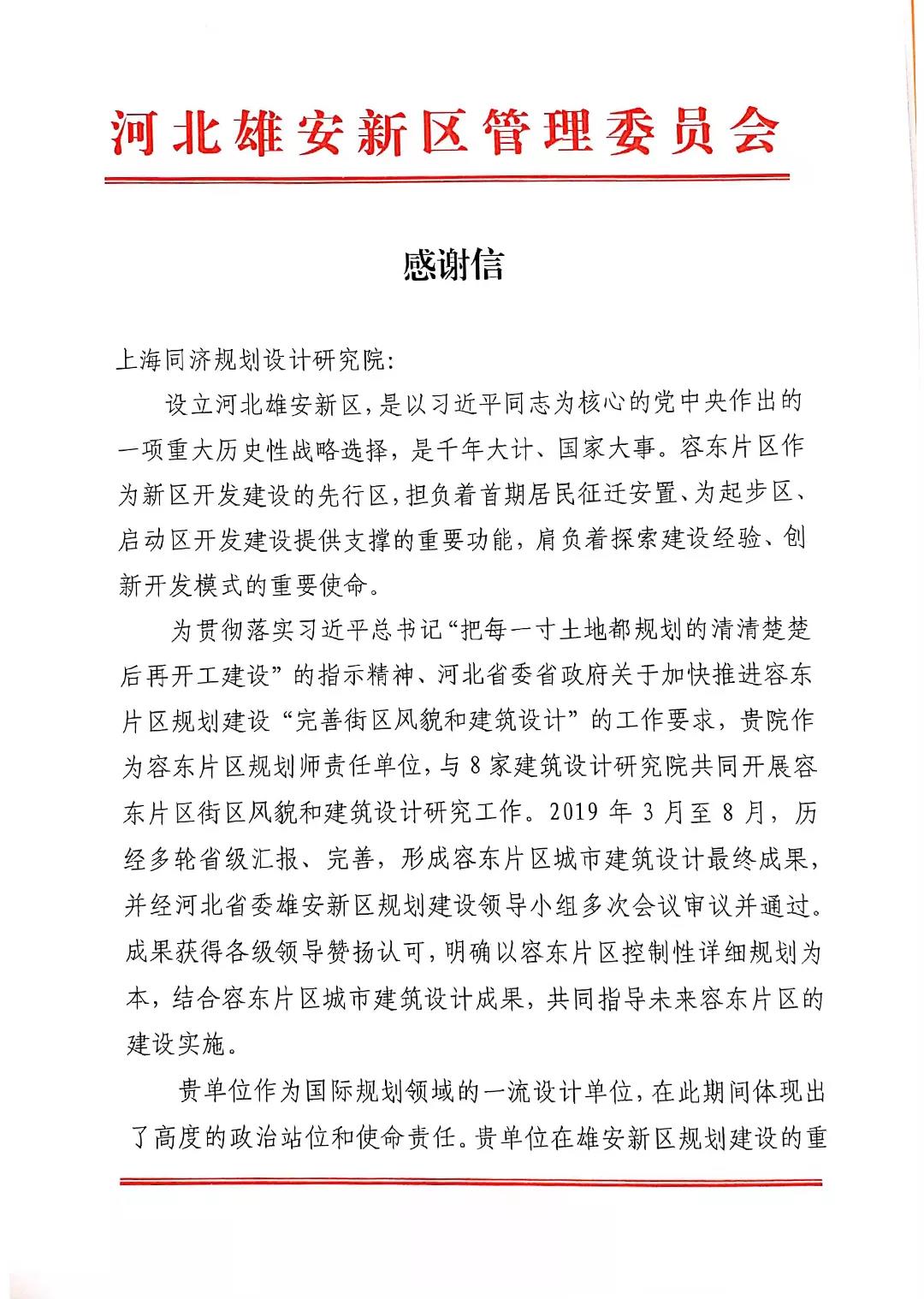 雄安新区管委会向我校发来感谢信,感谢同济团队为容东片区建筑设计、规划建设作出的突出贡献