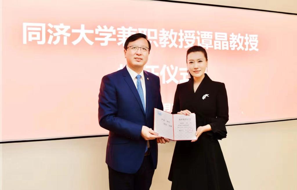 会上,陈杰为谭晶颁发了同济大学兼职教授的聘书并佩戴校徽。研讨会由同济大学设计创意学院特聘教授王敏教授主持。谭晶教授、孙捷教授、郁新安副教授等分别就“跨界艺术创作”“大时尚设计驱动的创新”“数字时尚与文化传承中的视野与实践”等主题展开了热烈的讨论。