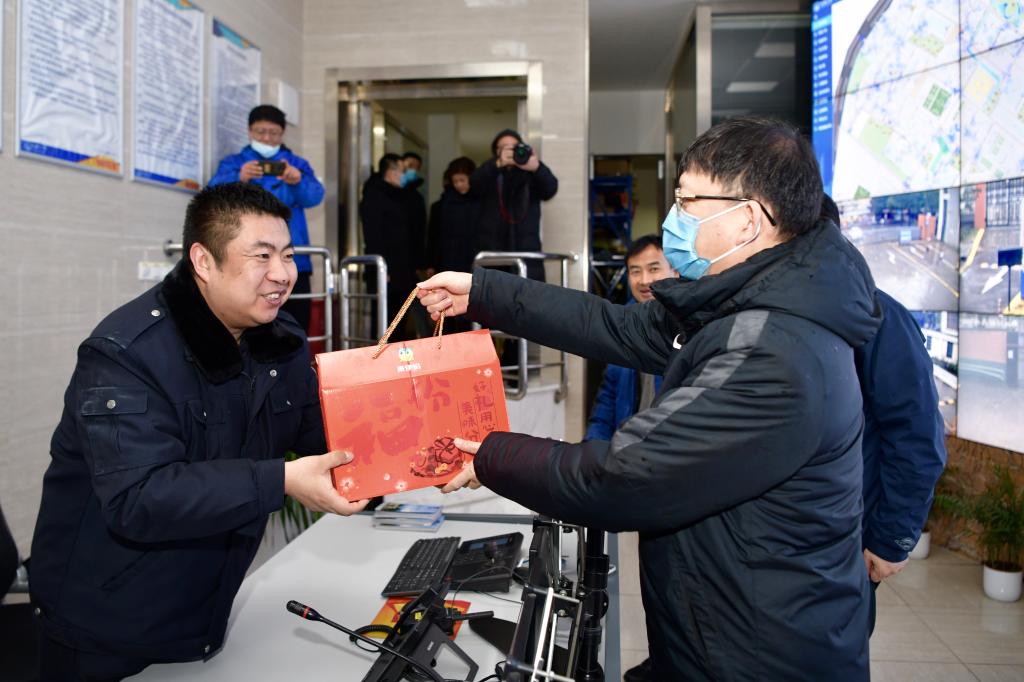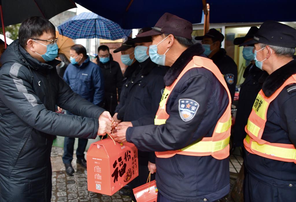 1月25日是大年初一,一大早,校党委书记方守恩带队,走访慰问了坚守在学校安全保卫、后勤服务和医疗保障一线工作岗位上的工作人员,向他们送上新春的祝福和慰问品。校党委副书记徐建平陪同慰问。