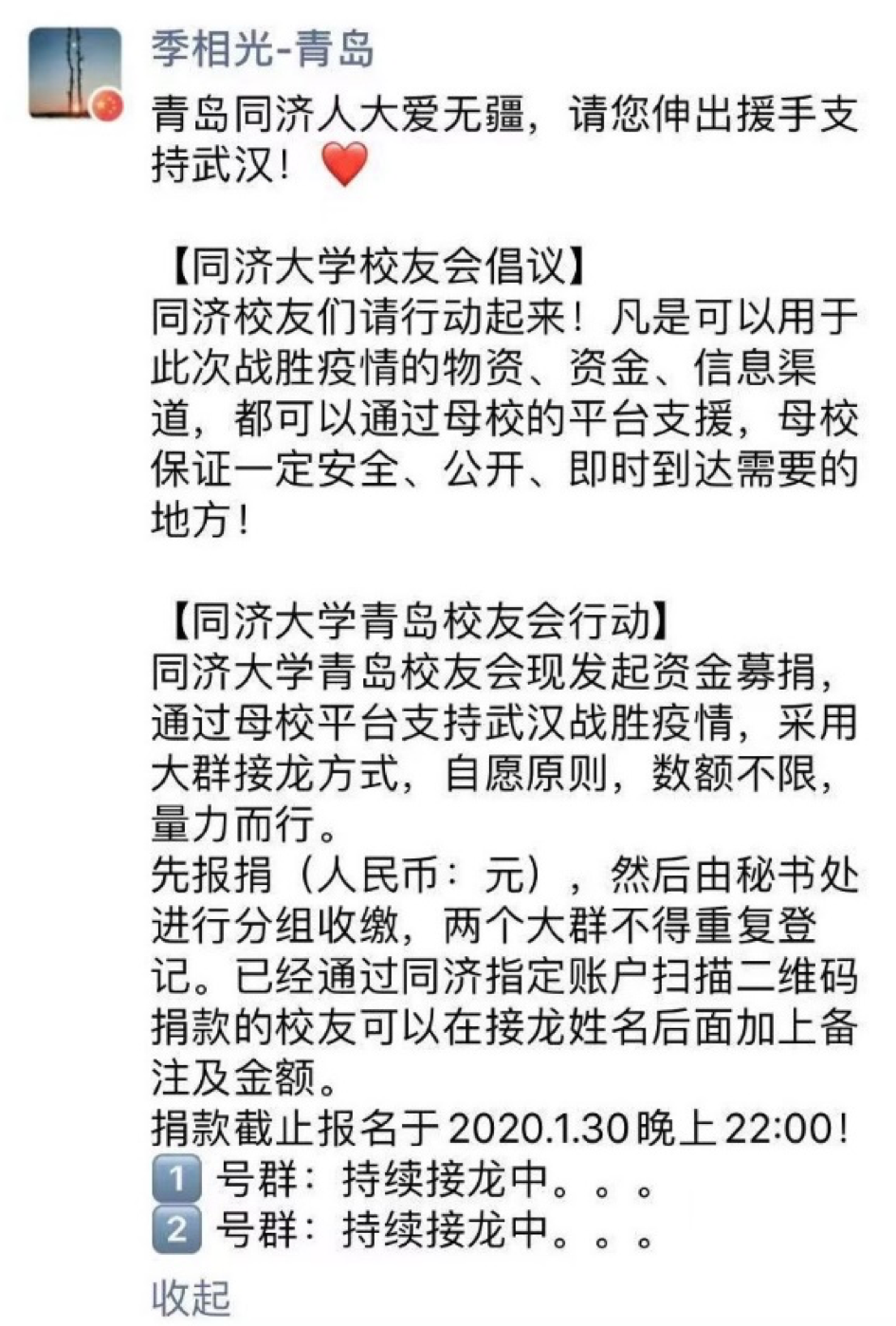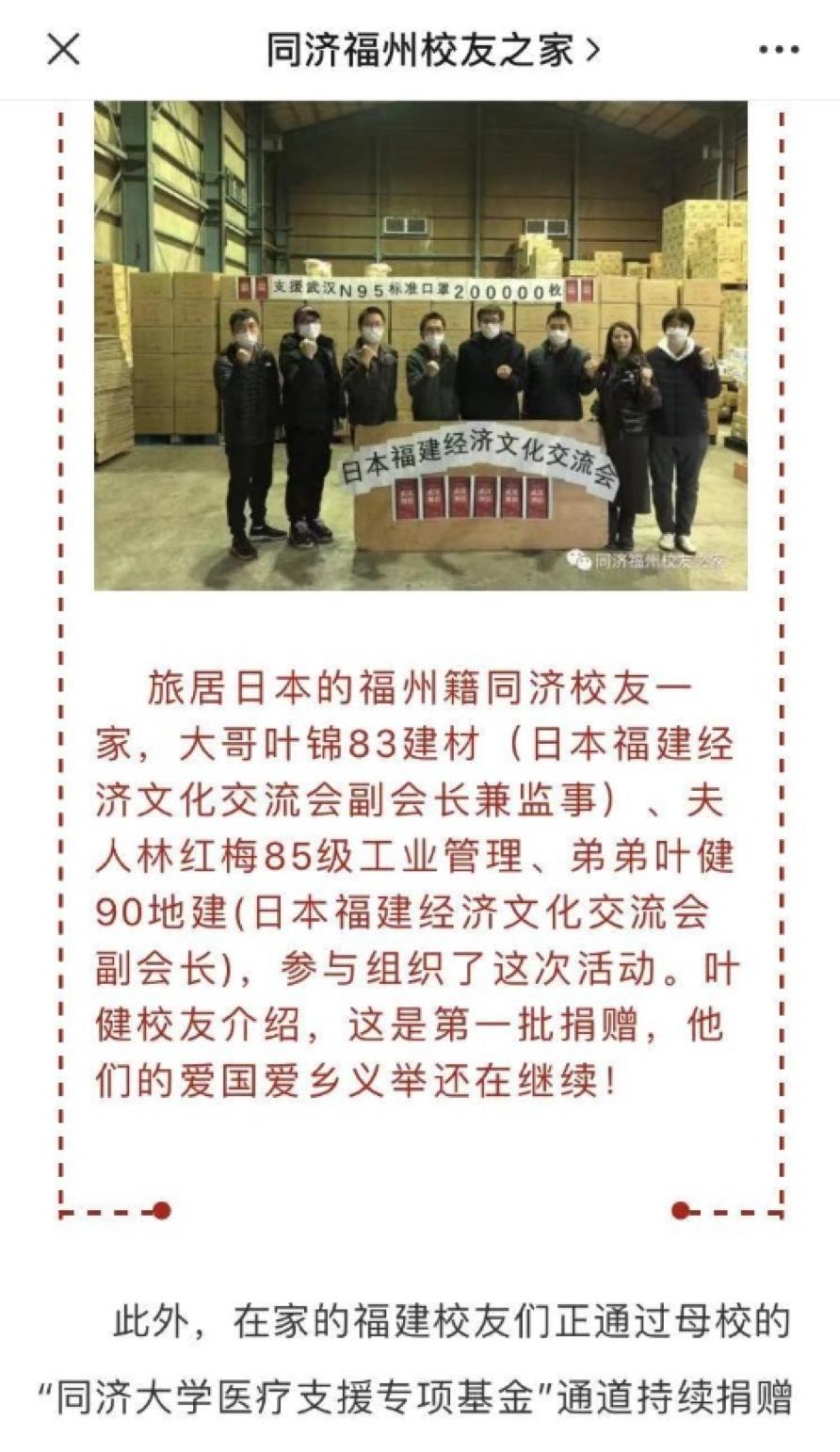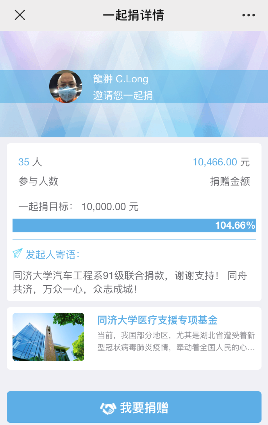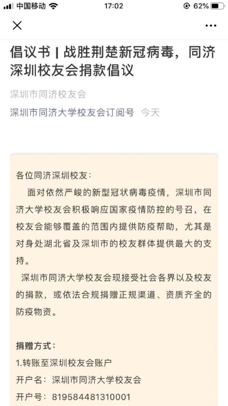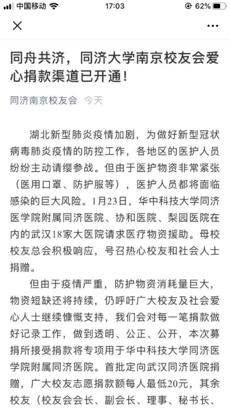1月28日,一则题为《行动起来!海内外同济人,誓与祖国人民同舟共济!》的倡议书,在同济大学校友会微信公众号上一经发布,立即在海内外同济校友中引发热烈反响。该倡议由同济大学校友会与同济大学教育发展基金会共同面向海内外校友发出,并发起“同济大学医疗支援专项基金”。世界各地的同济校友纷纷紧急行动起来,第一时间慷慨解囊、奉献爱心,或捐款,或利用各种渠道紧急采购、捐赠疫区当前紧缺的口罩及防护服等物资,一股股爱的暖流源源不断向疫区驰援。