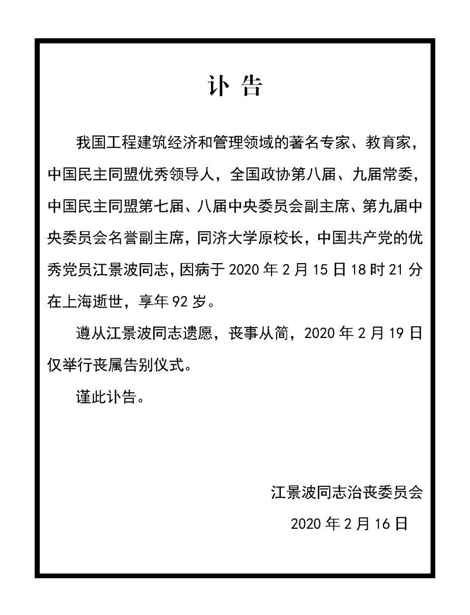 江景波同志治丧委员会办公室设在同济大学校长办公室