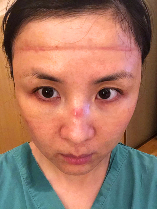 今天上班前没有贴安普帖,我跟搭班的媛媛鼻子和额头都被护目镜压得剧痛,手头上的事一空下来就更觉头晕眼花。为了转移注意力,我俩搜肠刮肚的找点别的话题,互相计划着等到疫情结束了去哪里吃火锅喝奶茶。脱掉防护服的时候,媛媛说:“你的鼻子今天压得红得厉害,像个小丑鼻子。”说完她又叹了口气,自言自语地说:没事,我也一样,等会戴上眼镜遮遮丑就好了。
