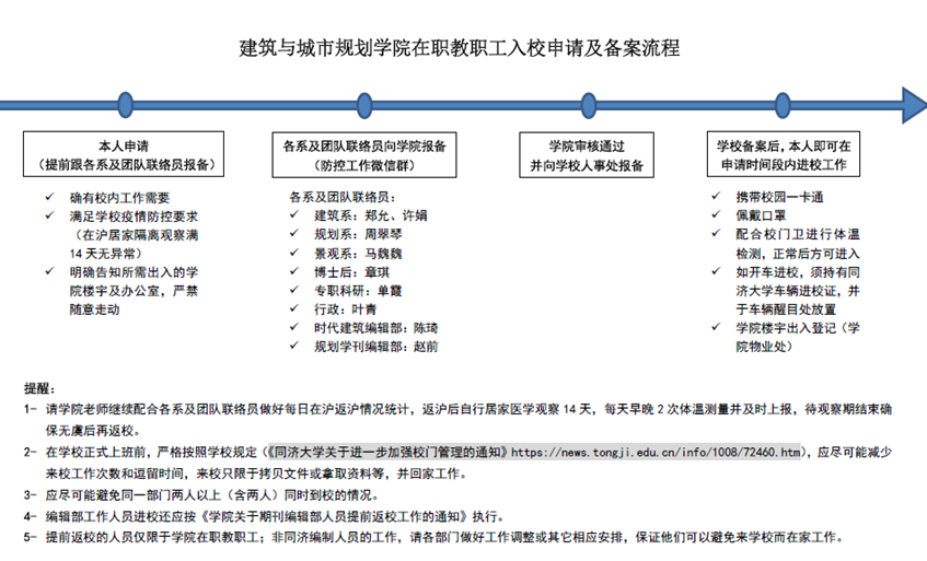 对于尚在重点区域的教职工,学院联络员一对一持续关注关心,劝导其留在当地,并做好安全防护;对于已返沪教职工,学院叮嘱其主动居家隔离观察至少14天,并主动报告其身体状况和接触者情况,做好相应记录;对于申请入住校区公寓的教职工,学院督促其完成入住线上申请,并持续关心其身心状态,做好日常生活保障与联系;对于申请返校的在职教职工,学院制定《在职教职工入校申请及备案流程》,要求其严格按照规定,携带相关证件,配合安全监测,做好疫情防控工作。