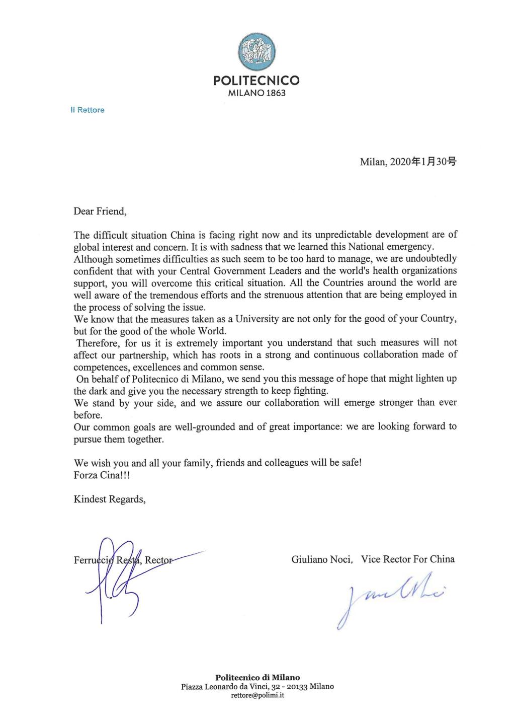 米兰理工大学校长Ferruccio Resta表示,我们毫无疑问地相信,在中国政府和世界卫生组织的支持下,中国将克服这一严峻形势。我们知道,同济大学所采取的措施不仅对中国有利,而且对整个世界也有利。