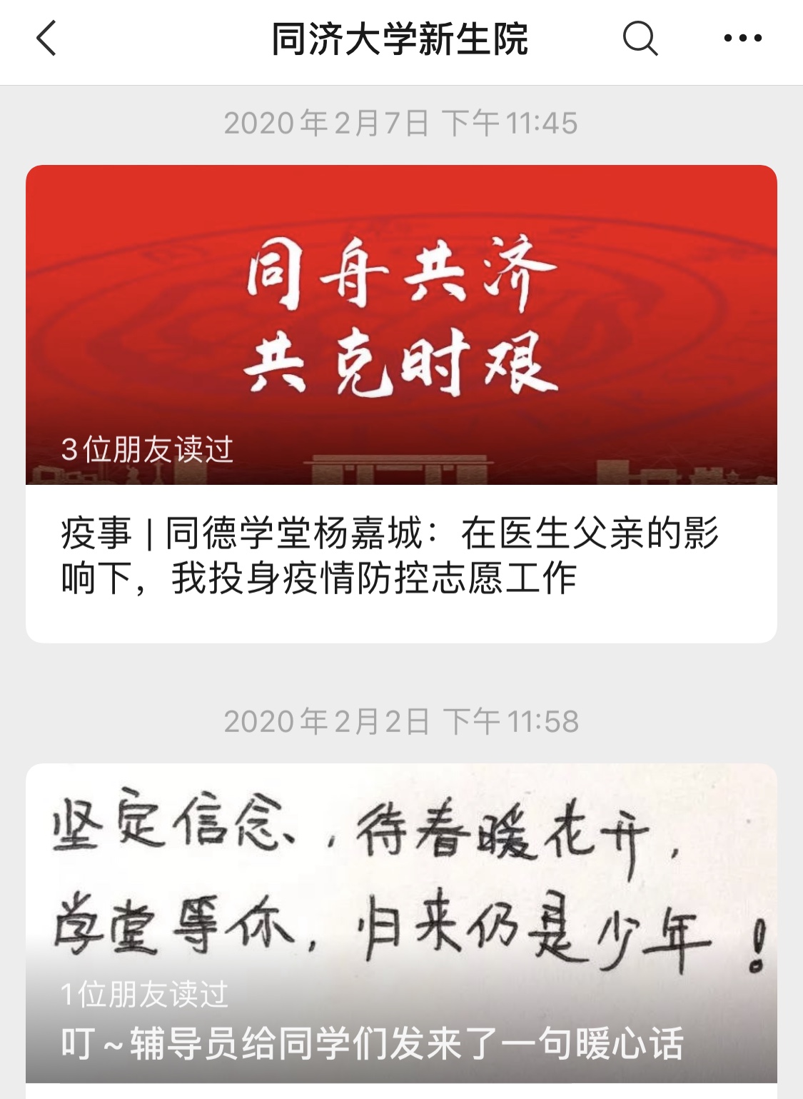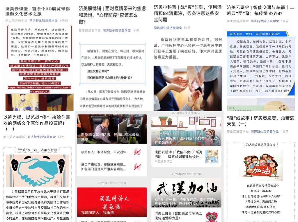 继新生院、济美学堂、同心济人学堂建设微信公众号平台,在疫情期间,济勤学堂、同德学堂陆续推出学堂公众号,开辟线上互动平台。同心济人工作团队通过学堂公众号,先后推出“同心济人防疫站”“云加油”“云德育”“班团在行动”等系列专栏,凝聚青年力量,推送原创主题累计阅读18945人次,学堂学生人均阅读24次;同德学堂结合水群、弹幕减压的特点开设B站直播,“同德社里欢乐多,宋泡安尼给你说,人类命运共同体,爱国主义要先行”,这样朗朗上口的网络传播口号受到了学生们的热追;济勤学堂借助学堂公众号“济小勤”,完善学生线上办事需求,结合短视频、H5页面互动等学生喜欢的传播形式,做好战疫宣传品展示、网课学习指南、时政评议等,创新学生思政和服务工作;济美学堂依托网络平台,疫情期间打造新生“云端校园文化”新品牌,推出“济美小科普”“济美解忧铺”等栏目,做好科学防疫知识普及、防疫心理疏导,推出“‘疫’线故事”系列推送,讲述疫情期间的暖心故事和济美学子投身志愿服务的担当。新生院团工委和新生院新媒体中心积极探索新媒体直播室建设,深度升级线上平台,为居家学习期间的学生线上思政工作做好硬件准备。