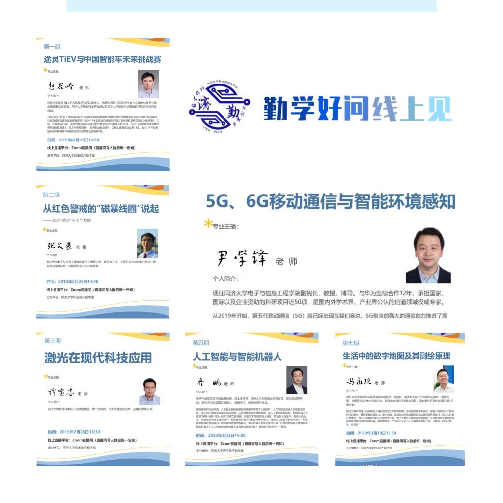 停课不停学,结合学生需求,学院策划“宅家学习资源推荐”专栏,方便同学们自学。教学中心联合各专业学院,推出“云享微课堂”“云听大咖说”等“线上学习金课”。同舟学堂为帮助学生尽快地适应网上教学,推进学习抗“疫”系列工作,开展“班级读书会”,同学们精心制作课件分享心得,组织线上教学、答疑“补考培训班”,为同学们开展数学、英语等多个学科的线上教学、答疑,为学生打造开放、共享、互助、和谐的优良学习氛围;济勤学堂结合专业兴趣启蒙,联动专业学院开展9期“勤学好问线上见”系列活动,千余人观看互动结合信息类学生特点,以线上赛代线下学,组织“居家智能小车大赛”“程序设计大赛”等比赛,提升学生科创意识;济美学堂协同专业学院,精心打造“济美云课堂|专业篇”“济美云课堂|美育篇”等系列推送,引导新生充分利用线上教育资源,推出“规划战疫”等推送,引导学生从未来专业角度思考如何贡献力量,最高单篇阅读3500,并邀请新生院教学事务管理中心、协同五大专业学院,及时推出“济美空中答疑会”,为学生心理调整和适应线上教学奠定基础;济世学堂开设云端读书会,通过组织线上共读《抗疫·安心——大疫心理自助救援全民读本》,邀请同济大学医学院副教授、硕士生导师,医学心理学博士史靖宇老师作为领读导师,引导学生们表达思考和困惑,为学生有针对性开展心理支持与情绪辅导。