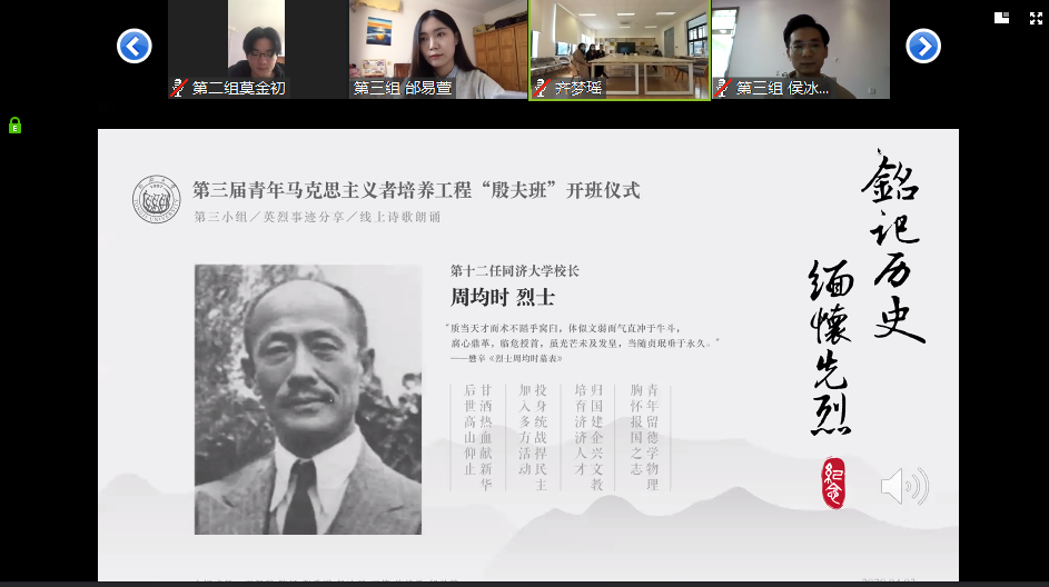 殷夫班全体学员分组朗诵了《血字》《我们是青年的布尔塞维克》等左联烈士殷夫生前的诗歌作品,共同展示、学习了朱觉、尹景伊、周均时、袁文彬、顾正红等革命英烈的事迹。同时,殷夫班学员们通过线上平台为殷夫烈士献上鲜花,通过网上祭祀寄托哀思、缅怀先烈,提醒自己时刻铭记历史,坚定爱国情怀,用不懈奋斗传承烈士们的理想信念,成为有理想、有本领、有担当的新时期同济青年。