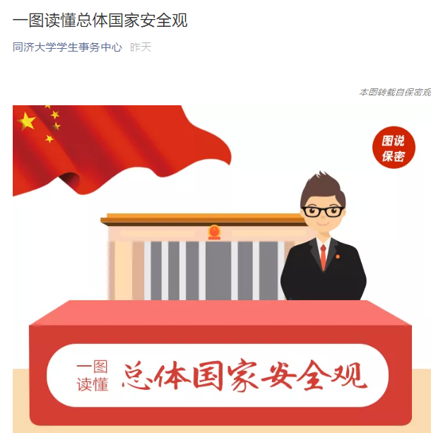 4月14日,学校组织学生观看一堂国家安全教育大课,通过新媒体平台积极转发权威部门、主流媒体相关宣传内容,如同济大学生、学生事务中心等公众号陆续推出《全民国家安全教育日:维护国家安全 你我共同守护》《一图读懂总体国家安全观》等推送内容,还特别开通保密微课堂,为同学们提供线上学习途径,以真实案例向广大师生进行科普。