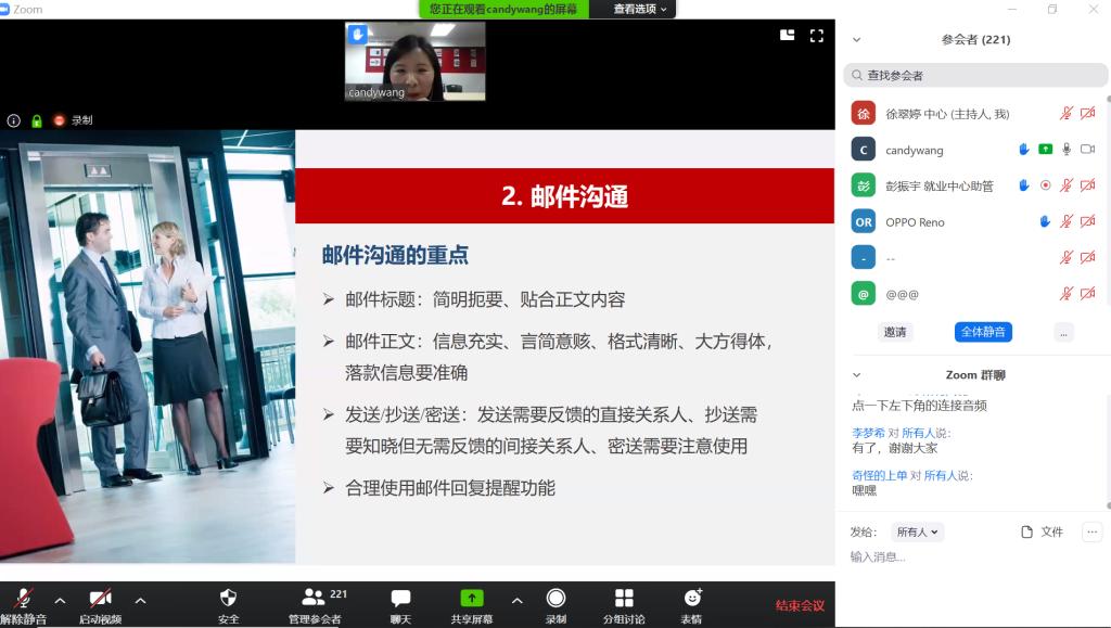 为帮助毕业生更好地应对线上招聘,学校还联同学院安排简历诊断、面试培训和礼仪指导等方面的线上训练营,这些富有针对性的就业指导活动颇受毕业生欢迎。学院则采用就业指导、就业选择、企业面试一体化的方法,助力毕业生们在空中课堂不断提升专业技能、成功求职。此外,关于线上双选会的问题也已开放答疑渠道,毕业生们可通过邮件形式直接与就业指导老师进行沟通。