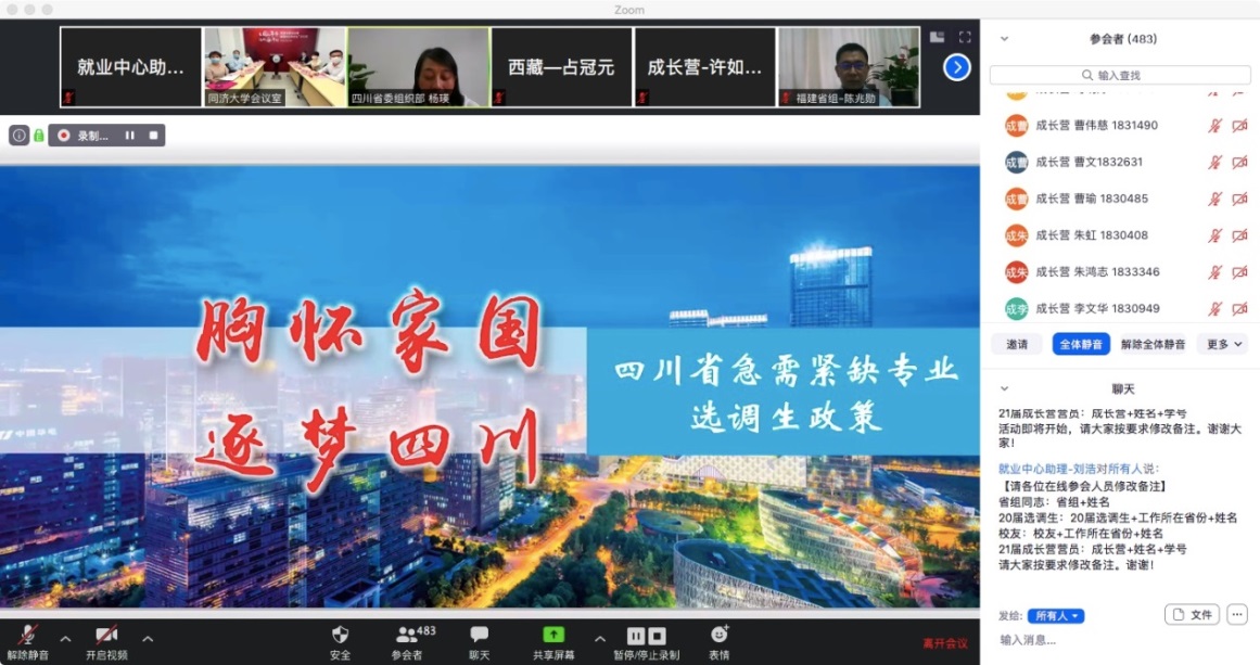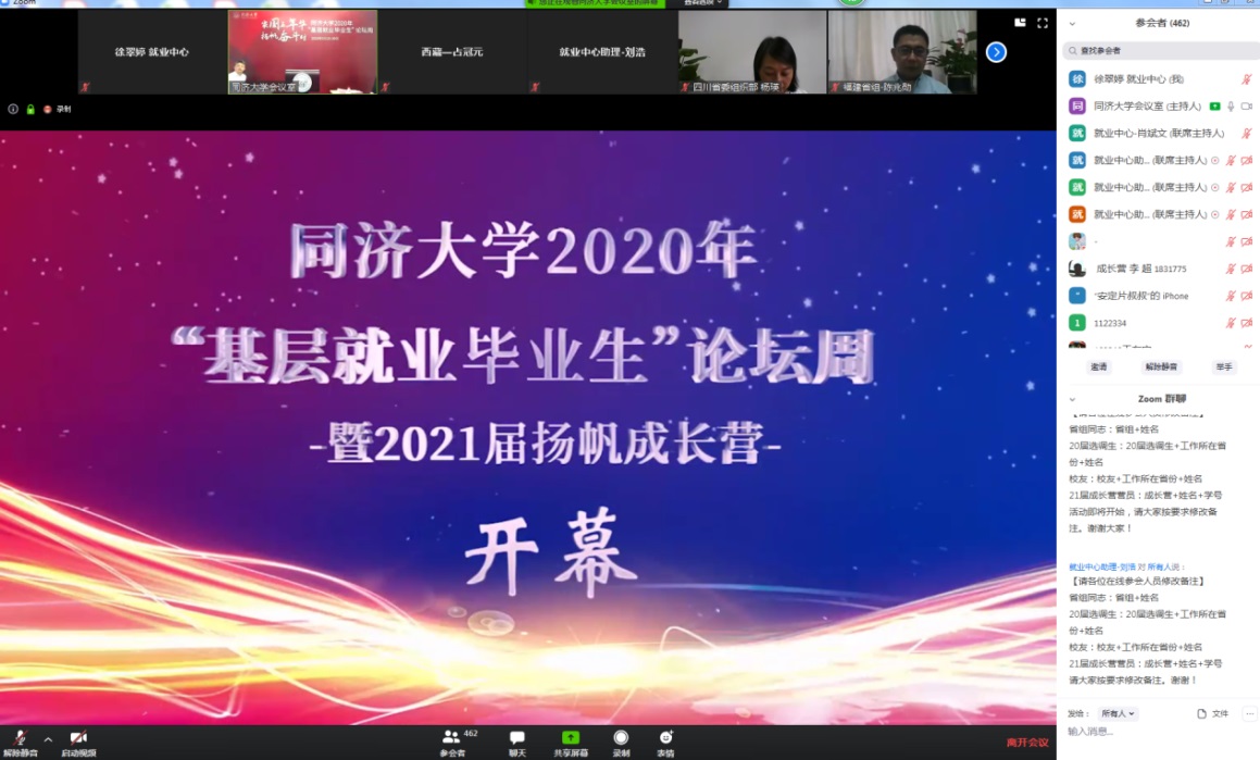 5月25日,以“家国正年华,扬帆奋斗时”为主题的同济大学2020年“基层就业毕业生”论坛周开幕式在线上举办。中共四川省委组织部公务员二处处长杨瑛,中共福建省委人才办主任、组织部人才工作处处长陈兆勋,同济大学党委副书记徐建平,校长助理、党委学研工部部长刘润,校组织部、对外联络与发展办公室、学生就业指导中心等部门负责人,各省市选调生校友,以及正在选调生录用过程中的学校2020届毕业生和同济大学2021届“扬帆成长营”营员共同参加。