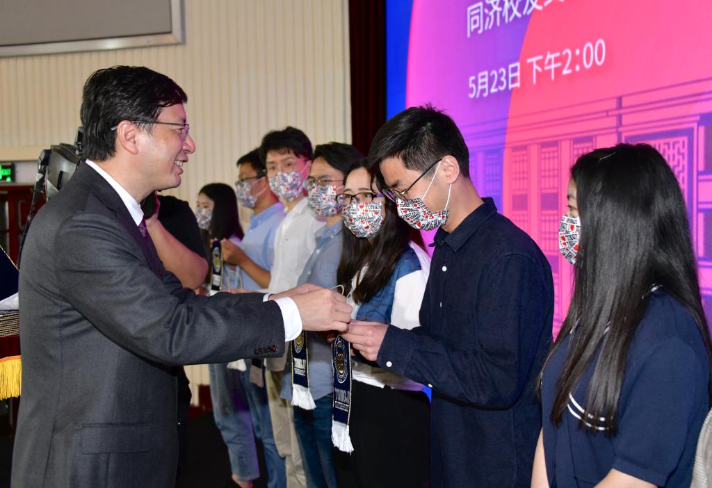 陈杰带领全体观看直播的校友,为同济校友终身学习平台喊出口号 “终身学习,我准备好了”,并祝福母校113岁生日快乐!在响亮的口号声中,课堂气氛又被推向新的高潮。最后,陈杰和校友会常务副会长雷星晖副校长共同为2020届毕业生代表授旗,并送上对毕业学子殷切的期冀与美好的祝福。