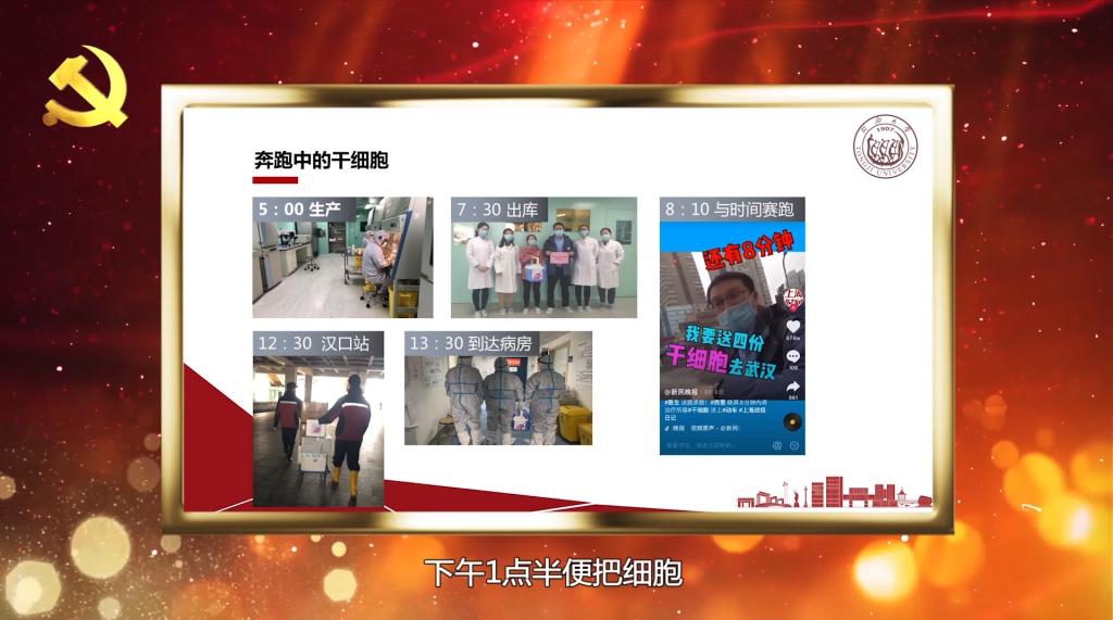 康九红讲述了我校国家干细胞转化资源库、教育部细胞干性和命运编辑前沿中心科研团队党员全员到岗,与时间赛跑,在干细胞治疗新冠肺炎重症患者的相关论证、可用于新冠肺炎治疗的脐带间充质干细胞的制备,以及脐带间充质干细胞治疗新冠肺炎重症患者临床研究等方面开展的一系列科研攻坚工作。