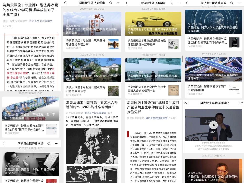 疫情期间,停课不停学,结合学生需求,新生院策划“宅家学习资源推荐”专栏,打造线上教育金牌活动,为学子营造积极向上的居家学习氛围。新生院联合各专业学院,推出“云享微课堂”“云听大咖说”等“线上学习金课”。同舟学堂开展“班级读书会”,为同学们开展数学、英语等多个学科的线上教学、答疑;济勤学堂结合专业兴趣启蒙,联动专业学院开展9期“勤学好问线上见”系列活动,以线上赛代替线下学;济美学堂协同专业学院,精心打造“济美云课堂|专业篇”“济美云课堂|美育篇”等系列推送;济世学堂开设云端读书会,组织学生线上共读。