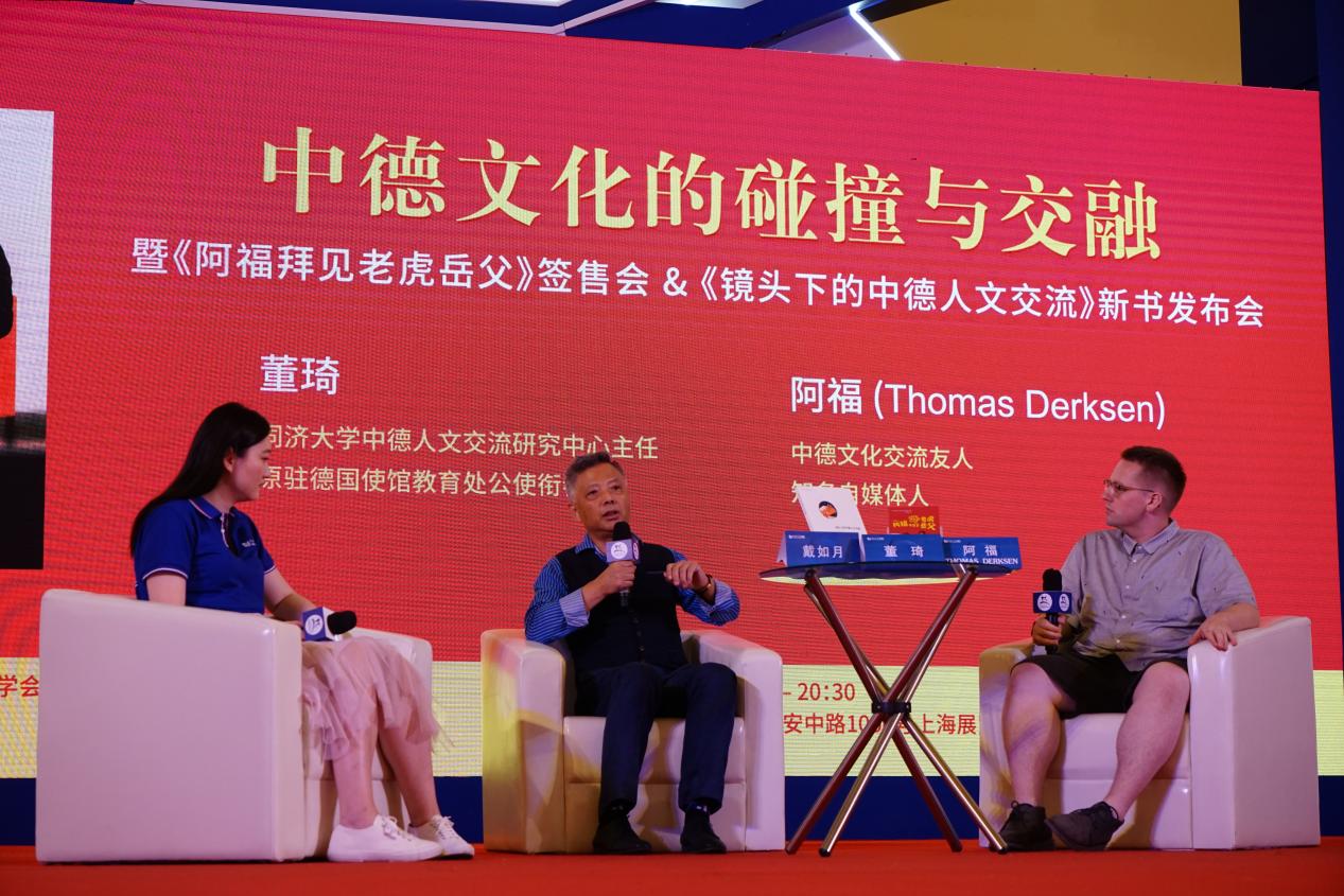 8月16日晚,一场风趣幽默、笑声不断的对谈在上海展览中心中央大厅展开。《镜头下的中德人文交流》新书主编、同济大学原副校长、同济大学中德人文交流研究中心主任董琦,《阿福拜见老虎岳父》一书的作者、来自德国的洋女婿阿福(Thomas Derksen),围绕“中德文化的碰撞与交融”这一主题,结合自身经历,与读者们分享了在工作、生活中遇到的中德文化交往方面的诸多趣事和故事。活动由同济大学中德人文交流研究中心、同济大学出版社联合主办,上海市欧美同学会留德语国家分会协办,通过线下讲座、线上同步直播的方式进行。