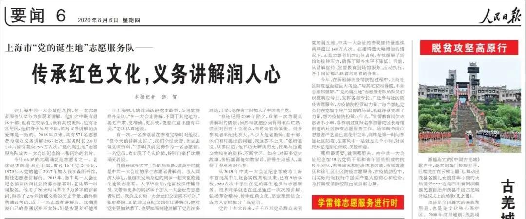 上述这段文字,摘自8月6日《人民日报》一篇题为《上海市“党的诞生地”志愿服务队——传承红色文化,义务讲解润人心》的报道。