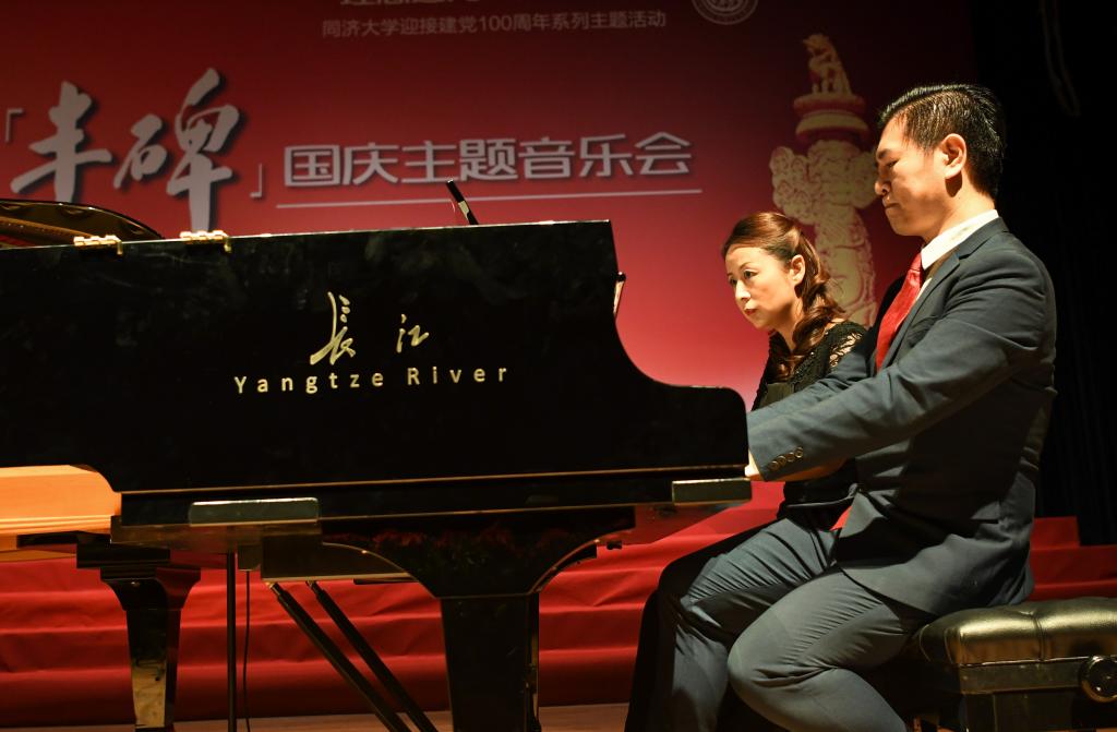 这场国庆主题音乐会由我校艺术与传媒学院师生担纲演出。音乐会一开场,同济大学学生弦乐团带来了一曲深情款款的弦乐合奏《我和我的祖国》,教师陈佳担任指挥。随后,艺术与传媒学院本科生王宝鹏的男声独唱《沁园春·雪》《我的祖国妈妈》,教师齐琳的小提琴独奏《丰碑》,本科生李辉雪的钢琴独奏《百鸟朝凤》,教师王伊达的女声独唱《我爱这土地》《映山红》,本科生侯欣聆的长笛独奏,教师沈婷的小提琴独奏,李辉雪、教师齐欢的双钢琴演奏,齐欢、隋歆、王夕岚、张弛四位教师的双钢琴八手联弹《保卫黄河》先后献演,其乐声、歌声或激昂豪迈,或舒缓柔情,或欢快奔放,奏、唱出了对祖国的赤诚之爱,将音乐会气氛不断推向高潮。台下师生凝神屏息静听,陶醉其中,会场不时响起一阵阵热烈掌声和喝彩声。