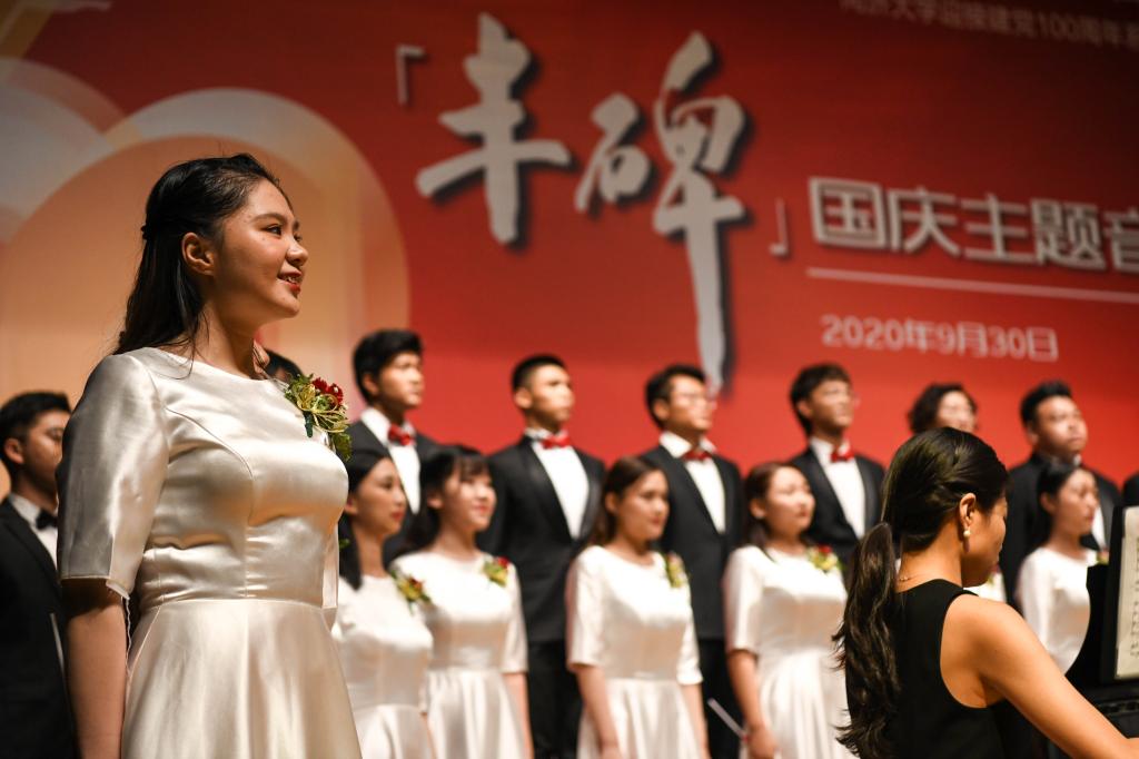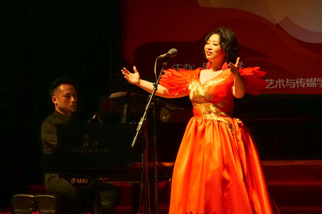 “不忘初心,继续前进。万水千山,最美中国道路。”“青春中国,中国青春,人类世界有我们东方的赞歌,东方的赞歌。”作为音乐会的压轴节目,学校1907室内合唱团表演了合唱《不忘初心》《青春中国》,教师朱洋担任指挥。最后,全场师生挥舞手中的国旗,齐声唱响一曲《歌唱祖国》。