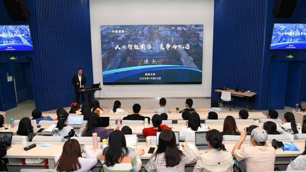 10月20日晚,作为本学期“中国道路”课的第二讲,校长陈杰以《人工智能前沿、竞争与机遇》为题,讲述了人工智能的前沿动态、未来发展趋势,介绍了我国新一代人工智能发展规划,勉励同济青年学子要自觉肩负起大国竞争的历史重任,坚定道路自信、坚持自主创新,瞄准人工智能发展前沿,勤奋学习、刻苦攻坚,为推动我国人工智能发展贡献力量。