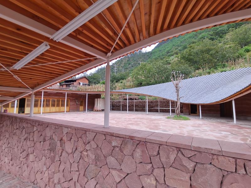 建筑的外立面主要分为两种做法,室外景观台地与地面采用了干砌片石的做法,同样反映了现代与传统、城市与乡村的产业互动关系。褐色的片石取材于山地开采中产生的边角废料,成本仅仅是运输的费用。而干砌的做法,在当地村舍的建造中被广泛使用:我们在村落中行走,随处看到四十厘米到六七米不等的“石脚”,也就是用石材砌筑的房屋的基础,高大规整的勒脚给人以朴实、稳重、坚硬之感,与土坯墙体、坡屋面一起构成了这一地域传统建筑的经典“三段式”。这既是对地方原生在地之灵的延续,也有助于凸显场所的自然粗野之感。