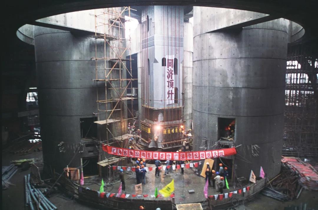徐鸣谦说,上海石洞口电厂240米钢烟囱就是同济人用液压顶升技术扶直树正的。针对东方明珠桅杆,团队提出了柔性钢绞线承重、提升器集群、计算机控制、液压同步整体提升的技术方案, 并专门设计、研制了钢天线桅杆液压提升设备。“也许是老天爷要考验我们,1994 年4 月20 日开始顶升,每天数十米的速度往上游升,转眼到了4月30日,距桅杆登顶只剩下23米。眼看胜利在望,气象预报即日起八级大风将到上海,持续一星期左右!”徐鸣谦回忆道,傍晚,大风不请自来,塔顶风速已超18米/秒,工作必须停下来!现场指挥部的气氛凝固了:继续提升,万一碰了砸了断了怎么办?不停工,悬在300余米空中的450吨“泰山”的桅杆荡起秋千怎么办?
