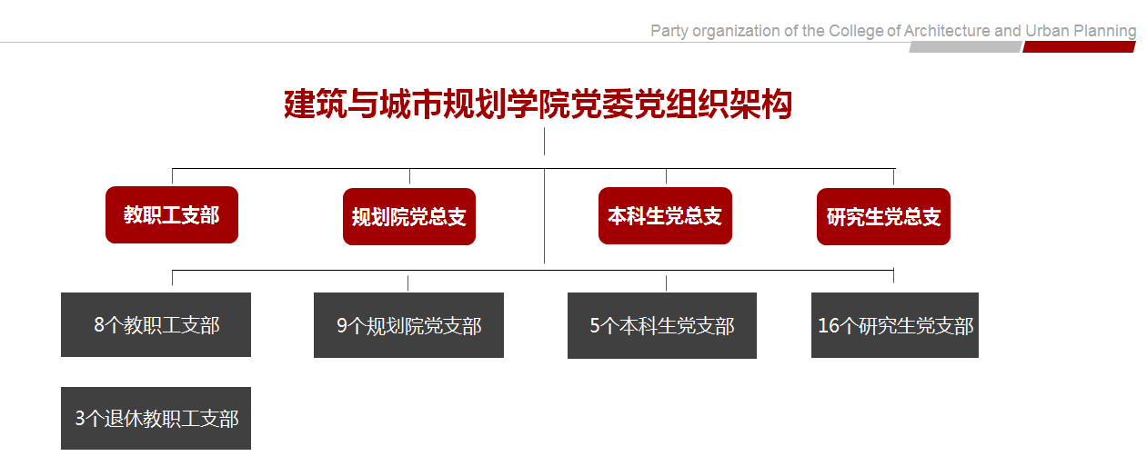建筑与城市规划学院党委下设3个党总支、41个党支部,共有1000多名党员。自2018年入选第一批新时代高校党建“双创”工作全国党建工作标杆院系起,两年来,学院党委坚持以习近平新时代中国特色社会主义思想、党的十九大和十九届历次全会精神为指导,围绕新时代党的建设总要求和新时代党的组织路线,严格对照对基层党委“五个到位”的要求,以聚精会神抓党建的责任担当和坚定行动,切实履行主体责任,以立德树人为根本,推动学院各项事业科学发展,扎根中国大地建设世界一流的建筑学、城乡规划、风景园林学科群,以优异成绩为决胜全面建成小康社会、实现“两个一百年”奋斗目标作出应有贡献。