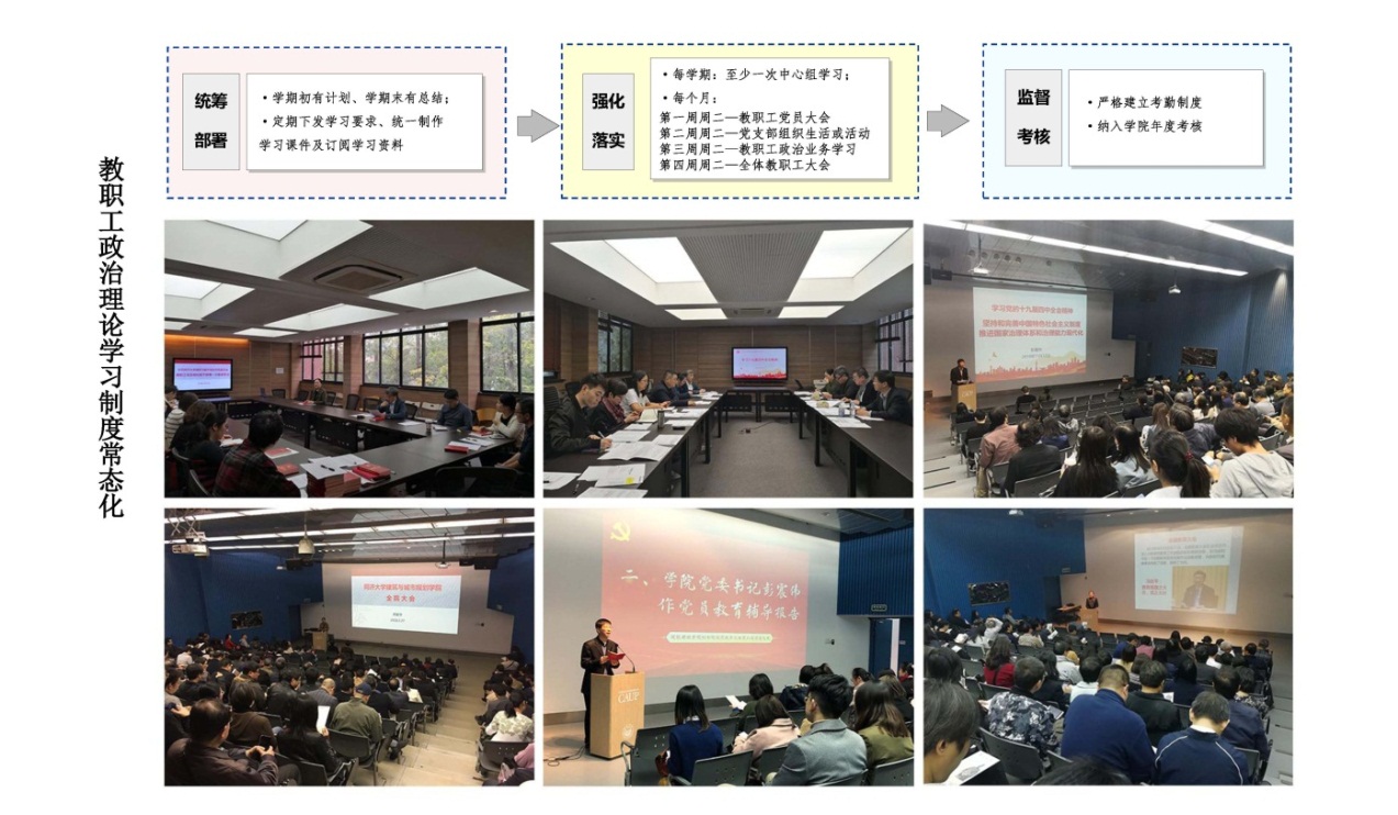 学院党委统筹部署,深入贯彻落实党的理论学习教育,建立经常性学习制度,切实落实到位,推进政治理论学习常态化。院党委还制定了贯穿全年、分层有序的教职工政治理论学习和思想政治教育活动,通过集中理论学习、专题培训、全院教职工大会、教职工党员大会及基层支部活动等多种形式进行,严格规定每周二下午开展各类政治学习和业务学习。学习和教育的内容力求贴近思想实际、当下热点和学科特色。同时,充分发掘身边党员的先进典型事迹,推出“榜样”系列专题,定期进行优秀师生党员先进事迹宣传学习,发挥党员示范引领作用,加强党风廉政、师德师风工作组织建设和教育落实。2019年,微视频《乡村造梦》荣获中组部第十五届全国党员教育电视片观摩交流活动三等奖,学院微信公众号今年入选首批高校思政类公众号重点建设试点名单。