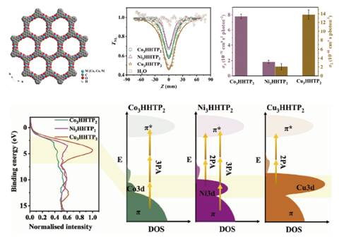 该研究团队还构筑系列金属有机框架材料(M3HHTP2;M=Co, Ni, Cu;HHTP= 2,3,6,7,10,11-hexahydroxytriphenylene)作为非线性吸收材料,通过过渡金属d轨道电子数量调控非线性吸收特征和性能。在532nm激光激发下,随着过渡金属3d轨道电子数量的增加,材料非线性吸收由三光子吸收逐渐转化到双光子吸收。相关成果“Superb Nonlinear Absorption of Triphenylene-Based Metal–Organic Frameworks Associated with Abundant Metal d Electrons”日前发表于《先进光学材料》(Advanced Optical Materials, 2021, 9, 2100622)。