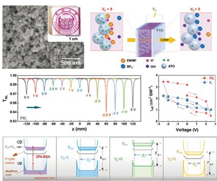 此外,在1030nm激光激发下,掺锑氧化锡(ATO)薄膜的五阶非线性吸收系数可由外压控制在0.51~3.46cm3GW-2之间连续调控。五阶非线性吸收行为源于纳米颗粒内部双光子吸收-激发态吸收的连续非线性吸收过程。外加电压可通过静电作用调制ATO纳米颗粒的能带弯曲程度和非耗尽层尺寸,从而使纳米颗粒在不同电压下体现不同的光学活性区域体积以及非线性吸收性能。相关成果以“Electrical Tuning of the Fifth-Order Optical Nonlinearity of Antimony-Doped Tin Oxide”为题发表于《先进光学材料》(Advanced Optical Materials, 2021, 9, 2001357)。