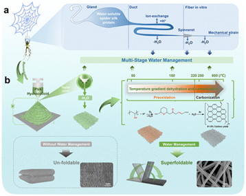 受到蜘蛛纺丝多级水分管理过程的启发,吴彤团队使用价格低廉且完全水溶性的聚乙烯醇(PVA)为原料,通过水溶胶静电纺丝,结合水管理的温度梯度脱水/碳化的联合仿生技术,制备出一种逼近超折叠极限厚度(~10μm)和极限比表面(~1370m2/g)的且能够承受100000次以上无损真折叠的碳纤维膜材料(PVA-SFCNFMs)。