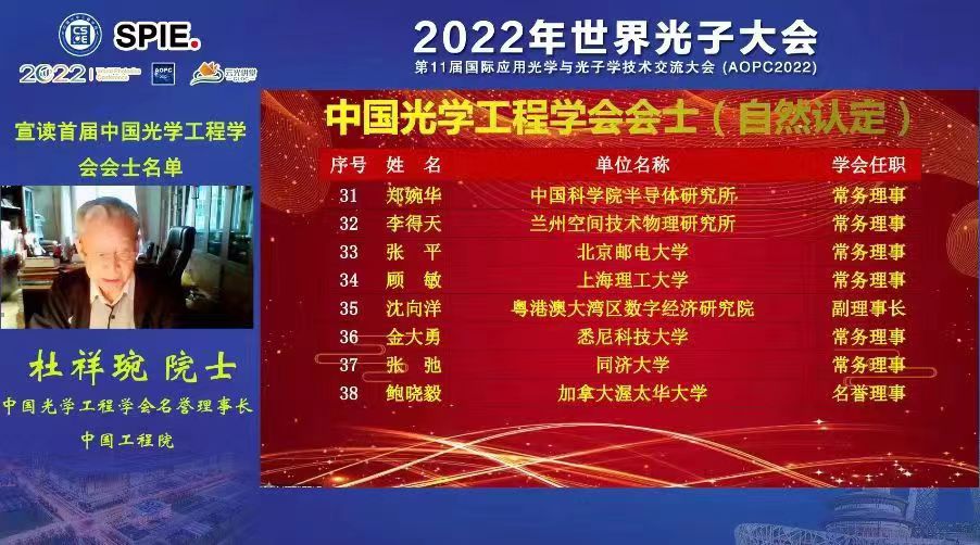 此外,在本次世界光子大会上,38位在国际光学基础科学研究、技术创新发明领域作出卓越贡献的中国科学院、工程院院士和国际主流科技发达国家科学院、工程院院士被自然认定为首届中国光学工程学会会士。我校欧洲科学院院士张弛教授因其在金属氧化物晶体材料与非线性光学学术前沿交叉研究中的杰出贡献而名列其中。