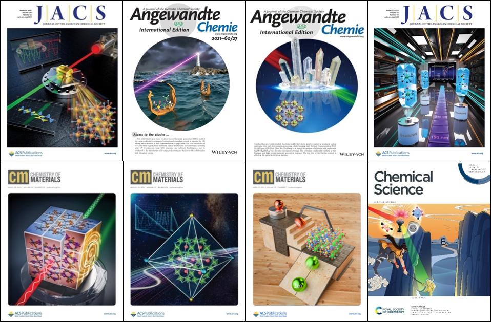 张弛院士领衔的创新研究团队历时5年,应用d0过渡金属、稀土金属等阳离子调控氧阴离子硫酸盐、磷酸盐、硼酸盐、碘酸盐、亚硒酸盐的协同组装和部分氟化策略,创制了系列倍频系数大、光学带隙宽、双折射率适中可实现相位匹配、激光损伤阈值高、透光范围宽、物理化学稳定性良好的深紫外/中红外二阶非线性光学氧化物晶体材料,突破了光学晶体微结构对其多项关键光学性能指标相互制约的技术瓶颈,有效提升了光学倍频晶体的激光频率转换性能,实现了氧化物晶体材料光学倍频系数和带隙等关键光学性能的同步增益。研究团队在该研究方向上的核心技术发明共申请国家发明专利36项,已获授权24项,10项进入实审,2项授权发明专利实现专利技术转让;发表高水平论文52篇,近两年18篇代表性论文发表在化学、材料学国际顶级学术期刊Journal of the American Chemical Society (3篇), Angewandte Chemie International Edition (7篇), Chemical Science、Chemical Materials (6篇), ACS Applied Materials Interfaces、Coordination Chemistry Reviews等上,其中3篇重要论文入选ESI TOP1%论文,4篇重要论文入选国际化学著名权威学术期刊Angewandte Chemie International Edition的Hot Paper,10篇论文被选为期刊的封面论文,3篇论文被引次数进入本研究领域的前20位。该研究团队所取得的上述系列原创性研究成果极大地提升了学科在光学晶体材料领域的学术影响力和同济的国际学术声誉。