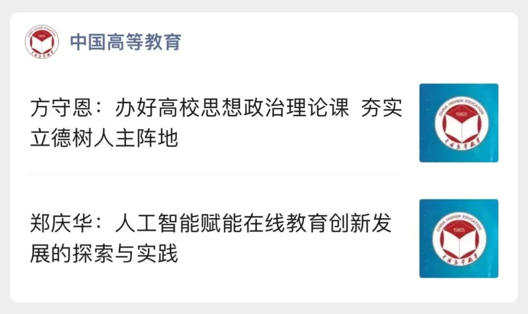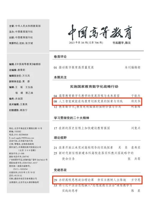 在最新一期的《中国高等教育》杂志上,同济大学党委书记方守恩、校长郑庆华的署名文章同时刊发,并获封面推荐。两篇文章的标题分别为《办好高校思想政治理论课 夯实立德树人主阵地》《人工智能赋能在线教育创新发展的探索与实践》。