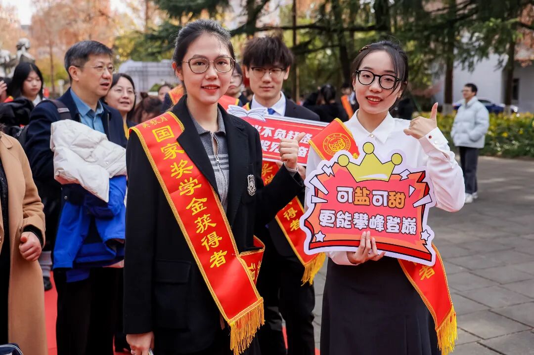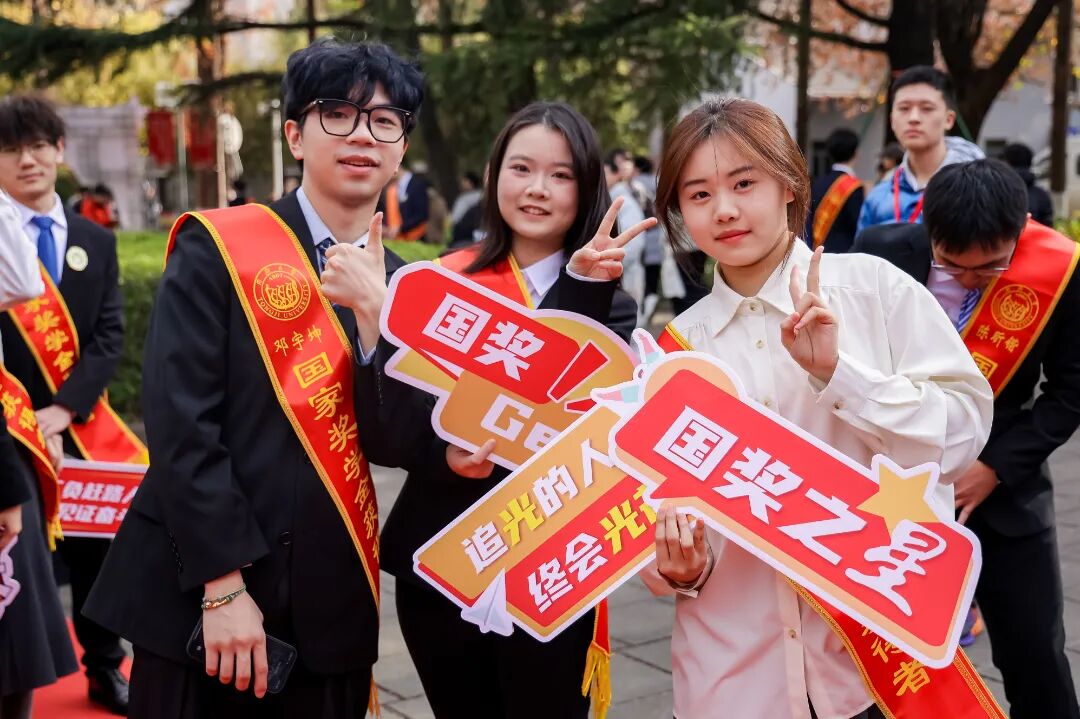 走红毯,寄“喜报”,与远道而来的家人合影留念,和共同成长的朋友分享喜悦。典礼前后,大礼堂外喜气洋洋。获奖学生们在学校专门设置的喜报邮筒、姓名墙前拍照打卡,仪式感满满。