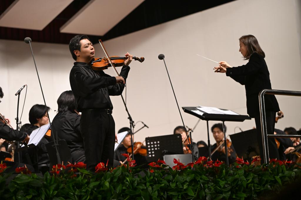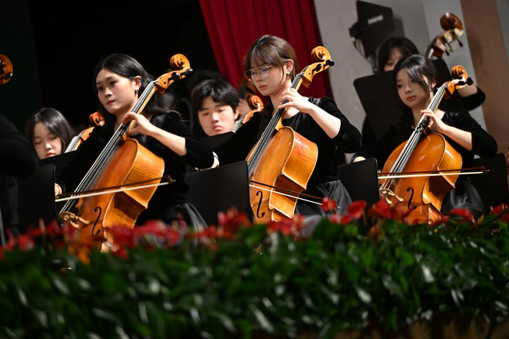 管弦乐合奏《花好月圆》《法兰多拉舞曲》《乡村骑士》《波莱罗舞曲》《电闪雷鸣波尔卡》,小提琴协奏曲《梁祝》……管弦声声诉真情,一曲曲悦耳动听的中外经典旋律接连奏响,乐音飞扬,动人心弦,将现场听众带入到欢乐喜庆的迎接新年氛围中。每当一曲终了,掌声四起。