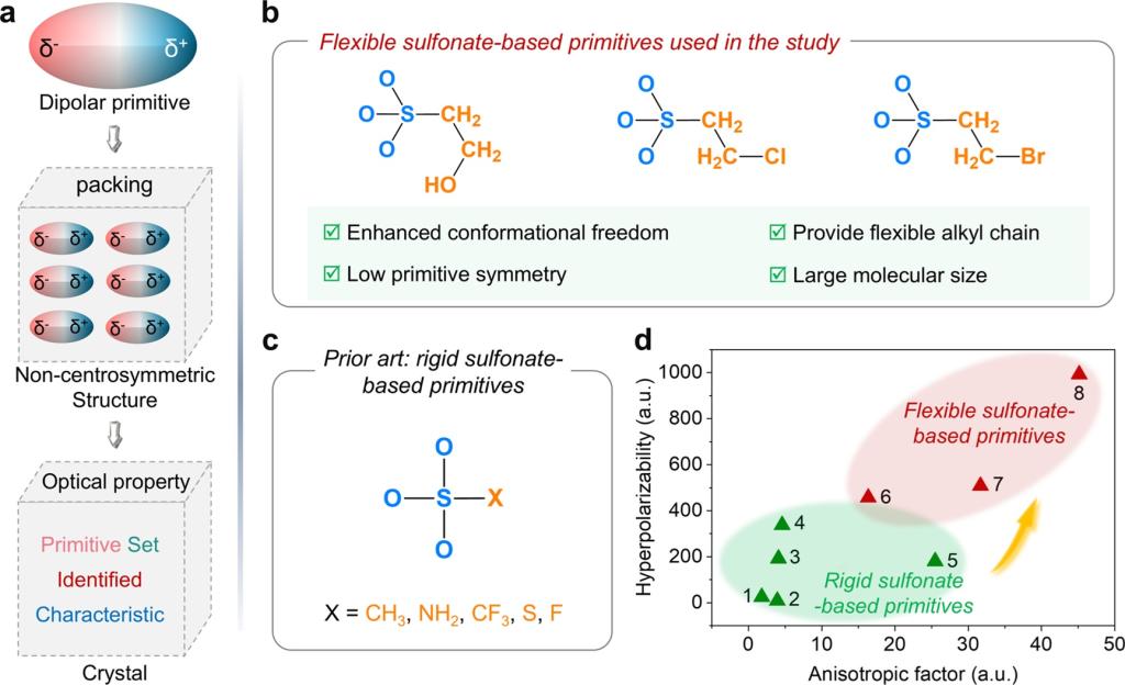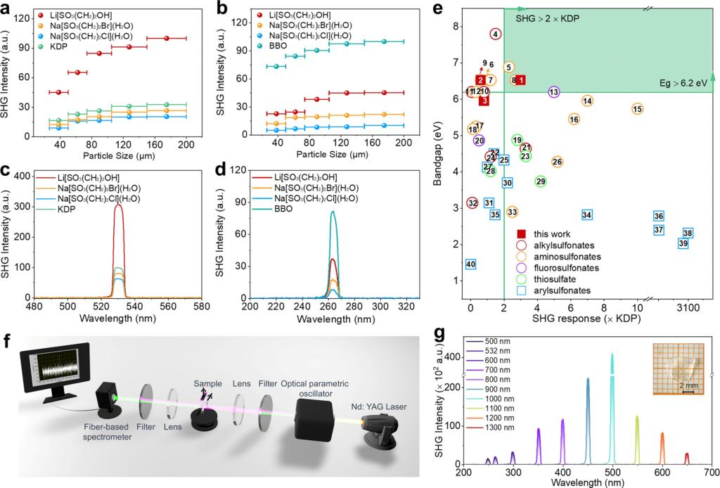 非线性光学晶体作为激光频率转换的核心材料,是获取深紫外激光光源的关键,广泛应用于半导体光刻、精密医疗、超快光谱以及遥感探测等高新技术领域。然而,当前商业化的深紫外非线性光学晶体普遍面临性能瓶颈,尤其是二阶谐波产生效率与宽禁带之间的固有权衡,制约了其性能的进一步提升。因此,研发兼具强非线性光学响应与深紫外高透明性的新型晶体材料成为该领域的迫切需求。