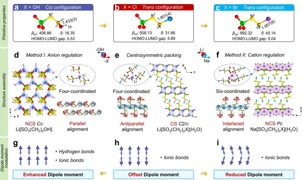 在这一研究中,针对传统有机磺酸盐晶体难以兼顾宽禁带与强二阶谐波响应的挑战,研究团队创新性地采用柔性磺酸根基元 [SO3(CH2)2X]- (X = OH, Cl, Br)作为构建单元,并通过两种路径实现结构与性能的精准优化:一是替换抗衡阳离子(Li+, Na+),以改变晶体配位环境与分子堆积方式;二是修饰阴离子烷基尾端取代基,从而调控分子间氢键作用与偶极矩排列。基于上述设计策略,研究团队成功制备了一系列新材料:母体化合物Li[SO3(CH2)2X] (X = Cl, Br), 极性化合物Na[SO3(CH2)2X] (X = Cl, Br),以及性能最优的Li [SO3(CH2)2OH]。研究发现,在Li [SO3(CH2)2OH]晶体中,[SO3(CH2)2OH]-阴离子通过氢键与离子键的协同作用形成平行排列,有效避免了偶极矩的相互抵消;而对比晶体Li[SO3(CH2)2X]和Na[SO3(CH2)2X]则分别呈现反平行和交错反平行排列。这种由连接性调控主导的结构差异,直接导致了晶体宏观光学性能的显著分化。