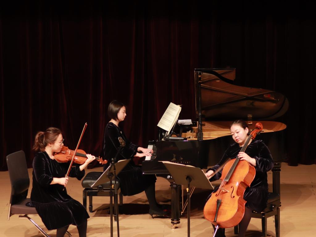 演出开始后,齐琳、张意嘉、周莹三位老师为在场观众带来了一首耳熟能详的《鸿雁》。悠扬的小提琴,糅杂着大提琴似喟叹似怀念的低语,又将亘古的思念缓缓渗入黑白键托起的一只只鸿雁身上,交织出一幅蓝天碧草、群雁齐飞的辽阔景象。周莹为观众讲解了下一首曲目《门德尔松op.49》中四个乐章所表达的情感,让观众能够更加理解如此美妙的乐章。中场休息过后,三位老师为大家带来了《贝多芬三重奏》。这首贝多芬年轻时期创作的变奏曲共有14段,乐曲亲切流畅,清新的乐段极为活泼有趣。《斯美塔那op.15》将整场音乐会推向高潮。张意嘉为观众介绍了乐曲创作的战争背景和作者创作时的复杂心境,乐曲高亢激昂、扣人心弦,急促的乐声扑面而来,诸多音符推搡着无法割舍的回忆,将这份悲切的心情推向观众。音乐会的最后,三位老师献上一曲《我和我的祖国》。熟悉的旋律回荡在一·二九礼堂中,观众们自发地唱和起来。曲终后,台下报以雷鸣般的掌声,在观众和主持人的强烈期盼下,三位老师再一次演奏《我和我的祖国》,全场观众大齐唱,将演出气氛推向了顶峰。