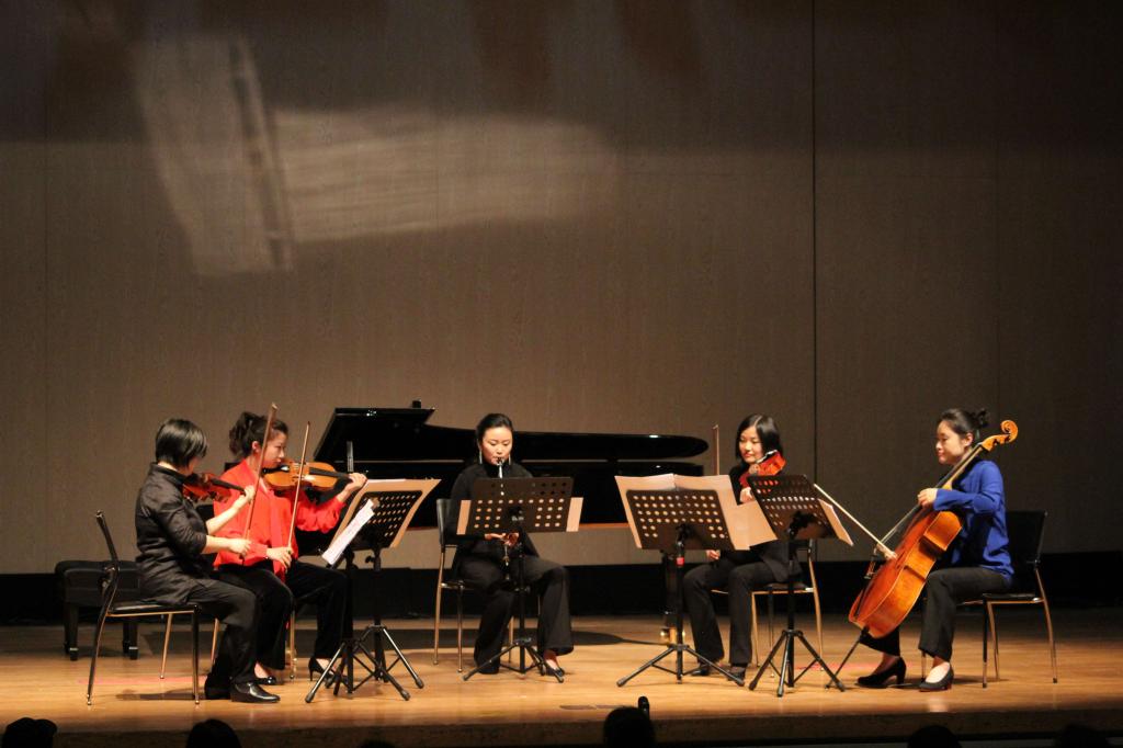 本场音乐会先后演绎了弦乐四重奏《戈壁赞》、室内乐协奏曲No.3《分流》、弦乐四重奏《刺青的雪》及单簧管与弦乐四重奏作品《音诗-黄昏》共四部作品。音乐会在曲目的选择上既充分展现了我国民族文化特色,又彰显了中西音乐文化的交融,在沈婷、马轲、杜娟、沈竞之、温宇昕、黄小珊、秦川等老师的合力演奏下,音乐的细节也得到了淋漓尽致地呈现。其中最后一首单簧管与弦乐四重奏作品《音诗-黄昏》由本次音乐会主持人沈叶老师作曲。沈叶分享了当时的创作感想,作曲部分灵感来源于海子的诗歌《黎明和黄昏——两次嫁妆,两位姐妹》,其中“黄昏”这一意象让他生发了许多思考。在他的乐曲中,“黄昏”既是写实,也象征着人生末年、变化终结等多种含义。在演绎过程中,五种演奏乐器既要相互融合,又要进行相互“竞赛”,一个持续的声音上有多种细微变化,在轻微的音调转变中还原了黄昏时的环境音,让人仿佛置身于真实的黄昏场景。
