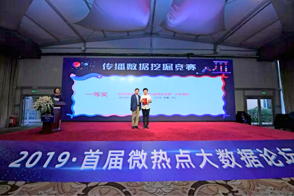 本次竞赛共分为初赛和复赛两个回合。比赛要求各团队在“昆山龙哥反杀案”“电影《我不是药神》”以及“创造101”三个公共事件话题中任选一项事件微博数据,自拟题目并运用数据分析和数据挖掘的技术以报告形式呈现分析结果。来自全国40所高校共81个团队参与了本次竞赛,11支队伍最终进入总决赛再度一较高下。最后经现场评委评定,我校“同济拓微队”凭借《网络良性越轨行为研究——以“昆山龙哥反杀案”为例》荣获一等奖。