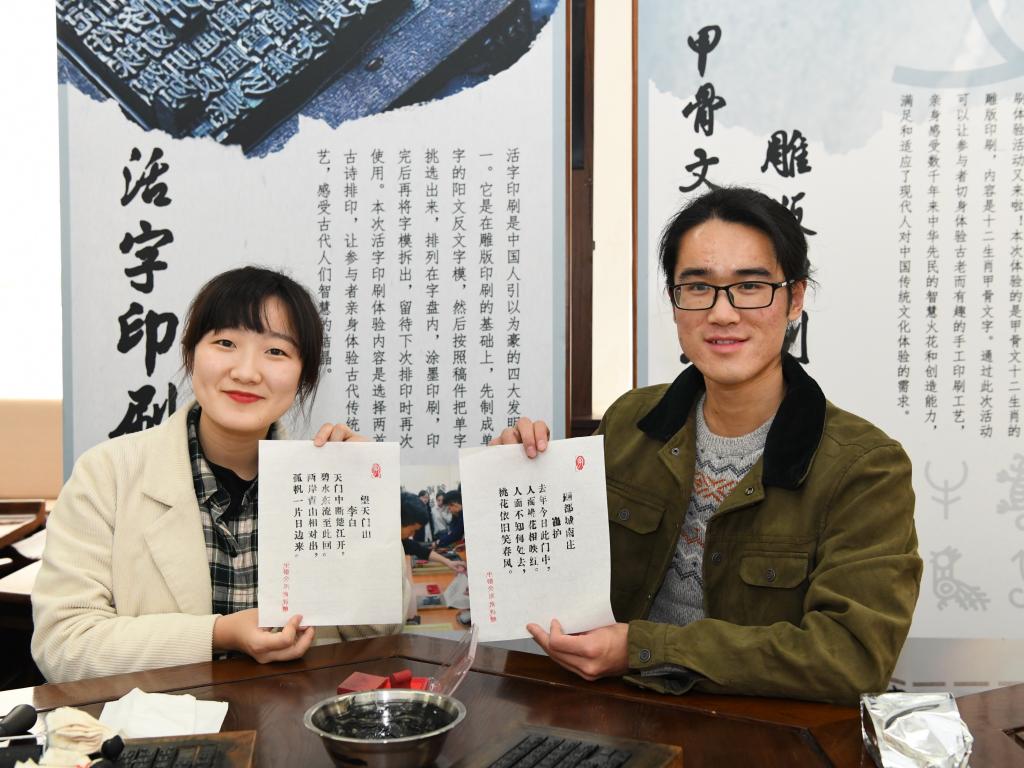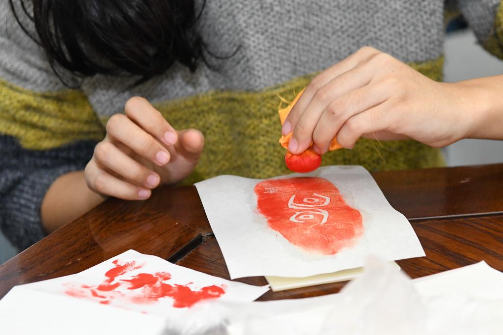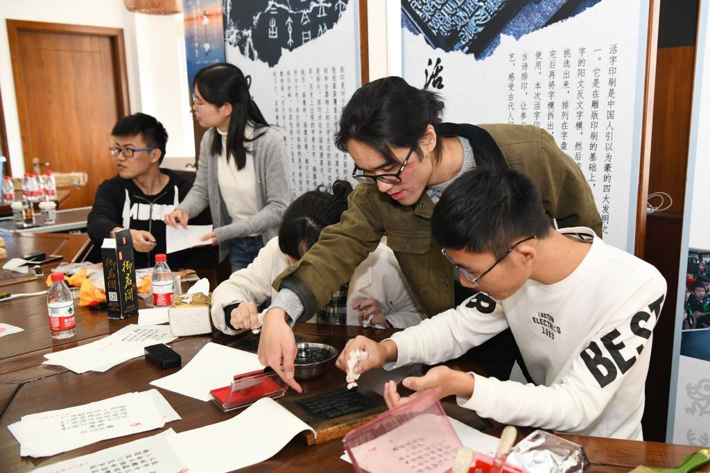 学子现场体验甲骨拓印及雕版、活字印刷工艺
